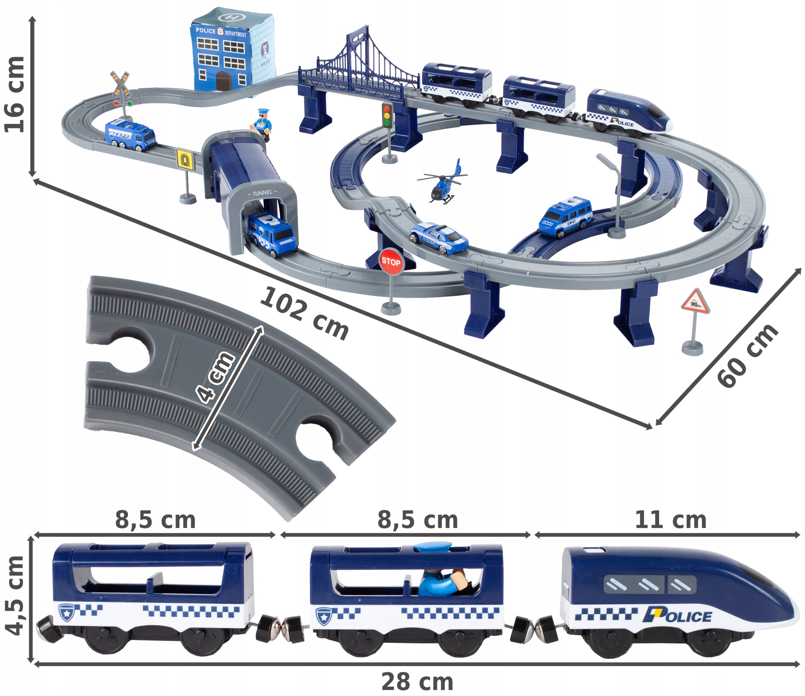Zestaw składa się z wielu ciekawych elementów tj. elektryczna lokomotywa z wagonem, 4 pojazdy policyjne, helikopter czy znaki drogowe.