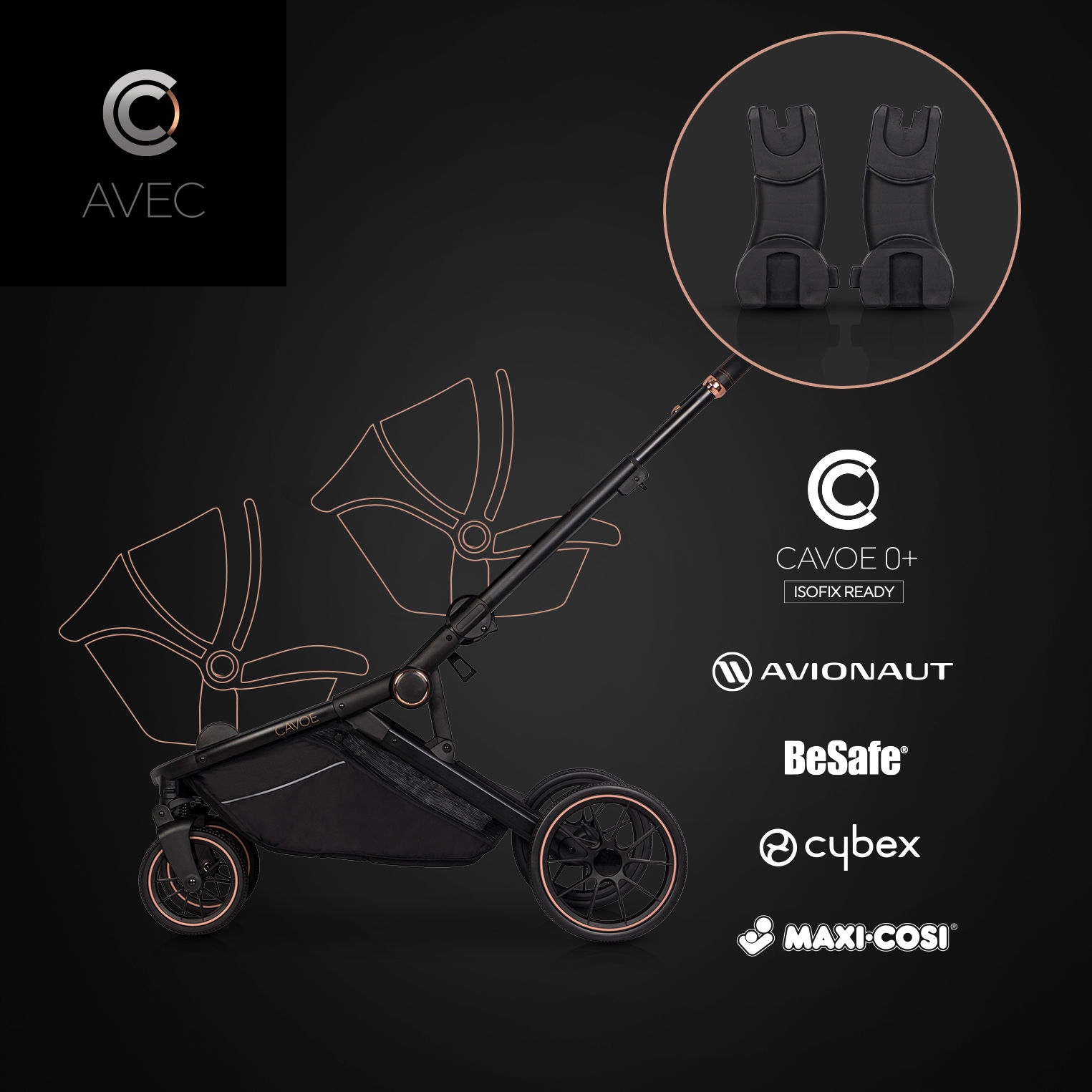 UNIWERSALNE ADAPTERY DO FOTELIKÓW SAMOCHODOWYCH – Marka CAVOE oferuje uniwersalne adaptery dzięki którym na stelażu wózka AVEC masz możliwość zamontować szeroki wybór fotelików samochodowych między innymi: CAVOE, MAXI COSI, CYBEX i AVIONAUT.