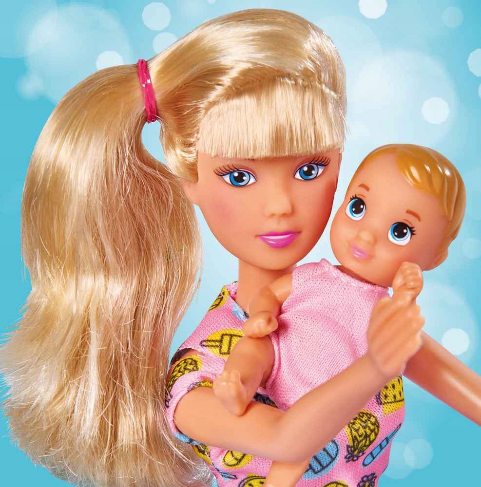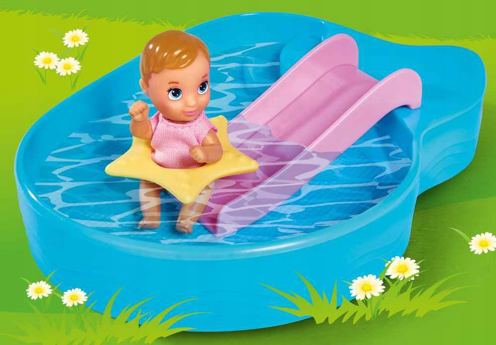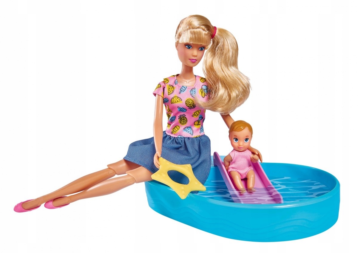 W upalne dni lalka Steffi ubrana w letnią sukienkę spędza czas z niemowlakiem nad basenem. W zestawie znajduje się basen ze zjeżdżalnią, do którego można wlać wodę aby uatrakcyjnić zabawę. Dla bezpieczeństwa dla bobasa zostało dołączone koło ratunkowe. Lalka Steffi ma zginane w kolanach nogi. Zestaw z pewnością przypadnie do gustu każdej dziewczynce uwielbiającej zabawę w dom i opiekę nad dziećmi, a dołączone akcesoria wzbogacą zabawę.