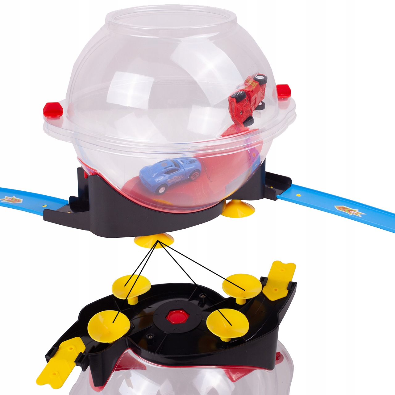 The race track in the shape of a transparent ball will surprise every little racing and car fan.