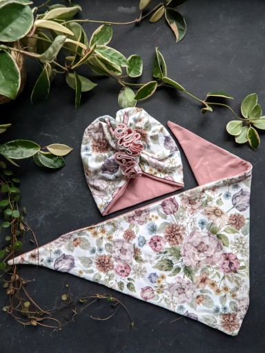 Дуже якісна фурнітура, пошита та розроблена в Польщі з сертифікованих матеріалів. Обидва елементи пошиті з двох шарів бавовни, шарф можна носити з двох сторін (з малюнком або однотонний).