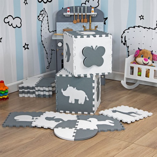 36 предметів,які дозволяють створювати різноманітні конфігурації як за кольором, так і за дизайном. Наведений розмір килимка є лише прикладом. Завдяки можливості комбінувати елементи різними способами, не тільки квадратними, ви можете пристосувати килимок до конкретних умов і вільного простору.