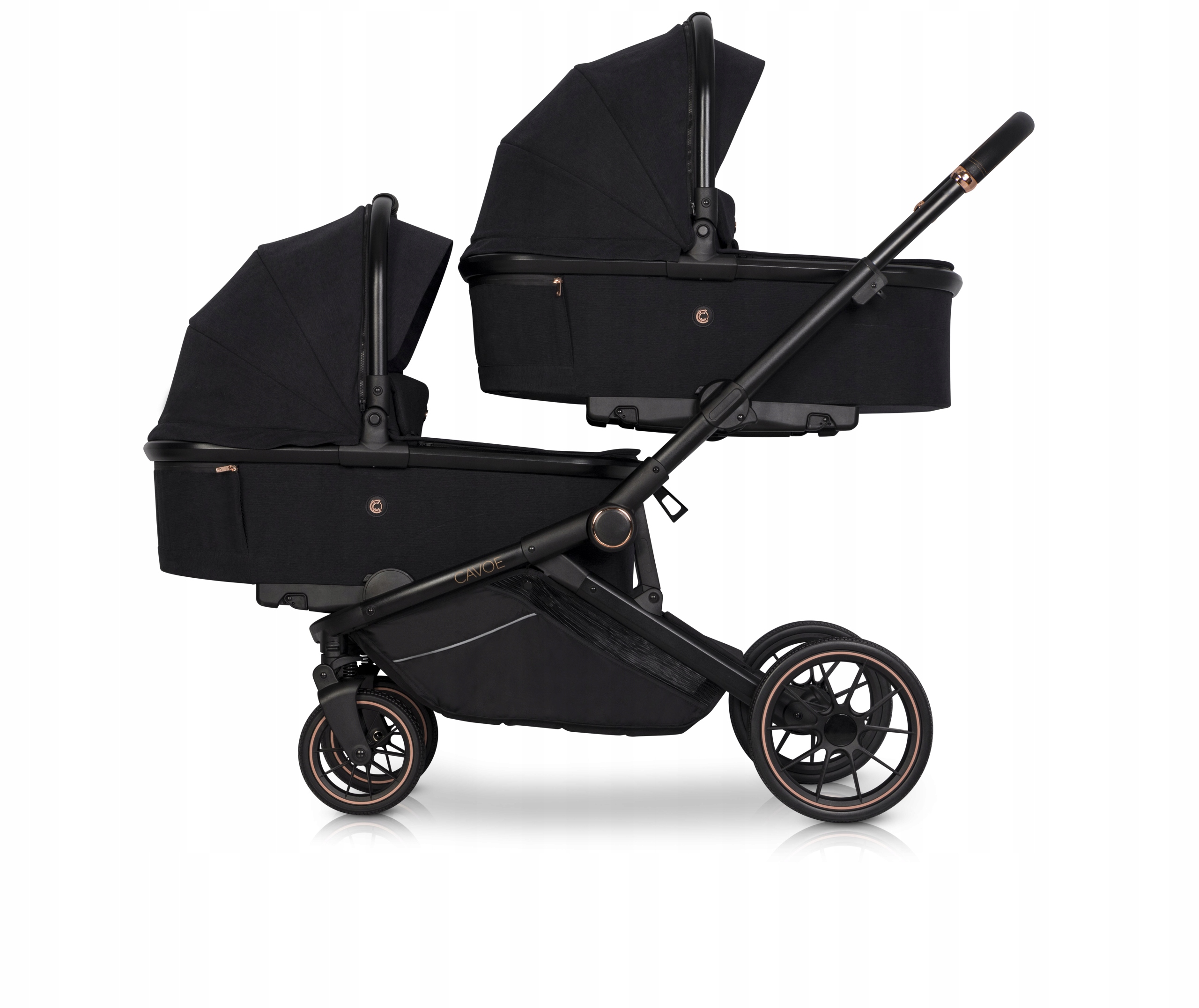 - Wózek dla bliźniąt w wersji z dwoma siedziskami spacerowymi i dwiema gondolami w wersji kolorystycznej METEORITE (kolor czarny)