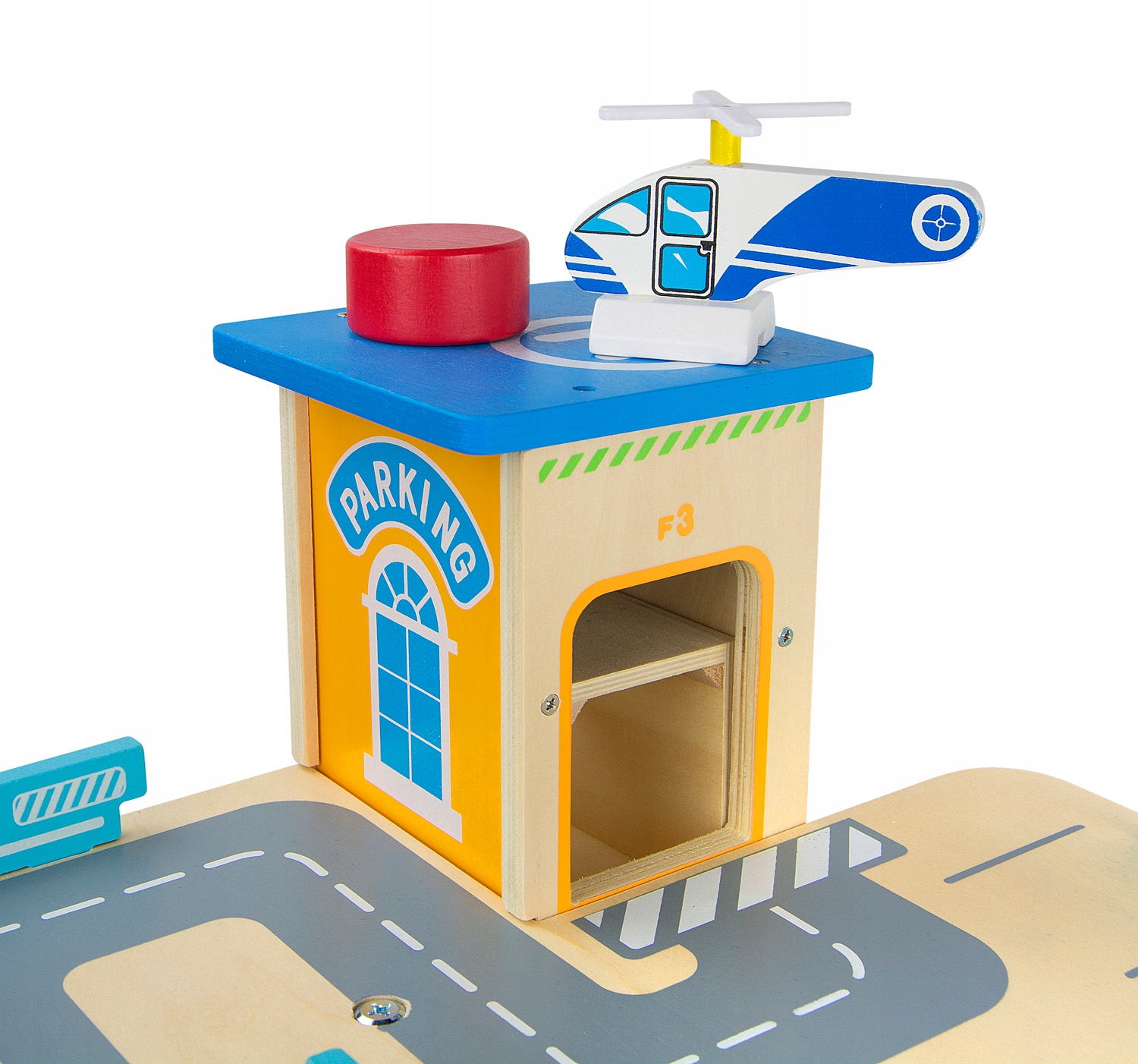 The car park is equipped with: an elevator, safety barriers, a barrier, ramps. In the bottom plate of the garage, special slots for connection to sets of wooden railways.