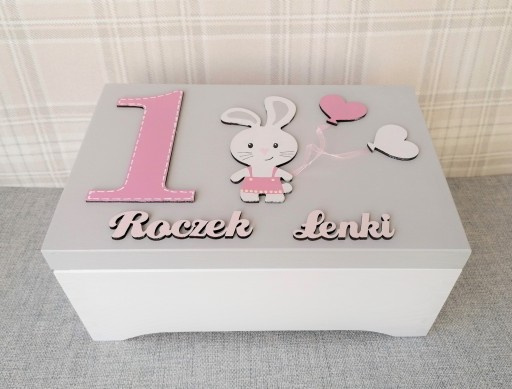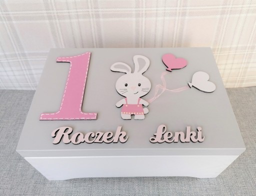 На кришці коробки, яка була пофарбована в світло-сірий колір, велика цифра 1 та декор у формі зайчика, розписаний нашими майстрами вручну.