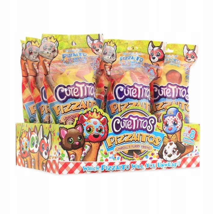 Cutetitos Pizzaitos to urocze, supermiękkie pluszaki, każdy owinięty kocykiem w kształcie pizzy. Czekają na odwinięcie i zabawę! Żeby przekonać się, czy Wasz Cutetitos jest świetny, świetniejszy, najświetniejszy czy superświetny, sprawdźcie jego „gorący punkt”, czyli ikonkę w kształcie kawałka pizzy, którą ma na biodrze!
