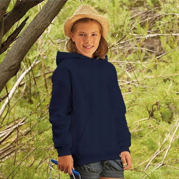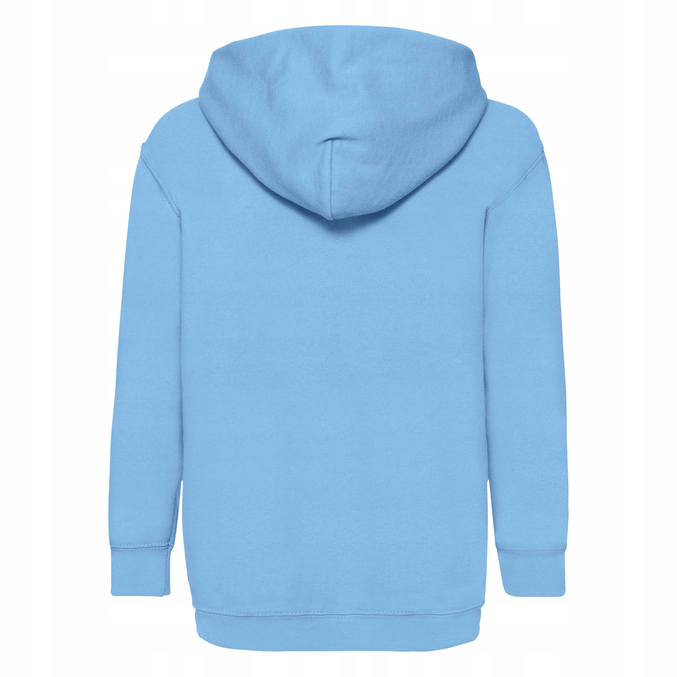 Bluzy dziecięce Hooded Sweat Fruit Of The Loom z kapturem z podwójnego materiału, zszytym z tyłu, bez sznurka. Kieszeń naszyta z przodu. Ściągacze zakończone prążkowaną taśmą bawełnianą z dodatkiem Lycry. Miękka w dotyku przędza Belcoro.