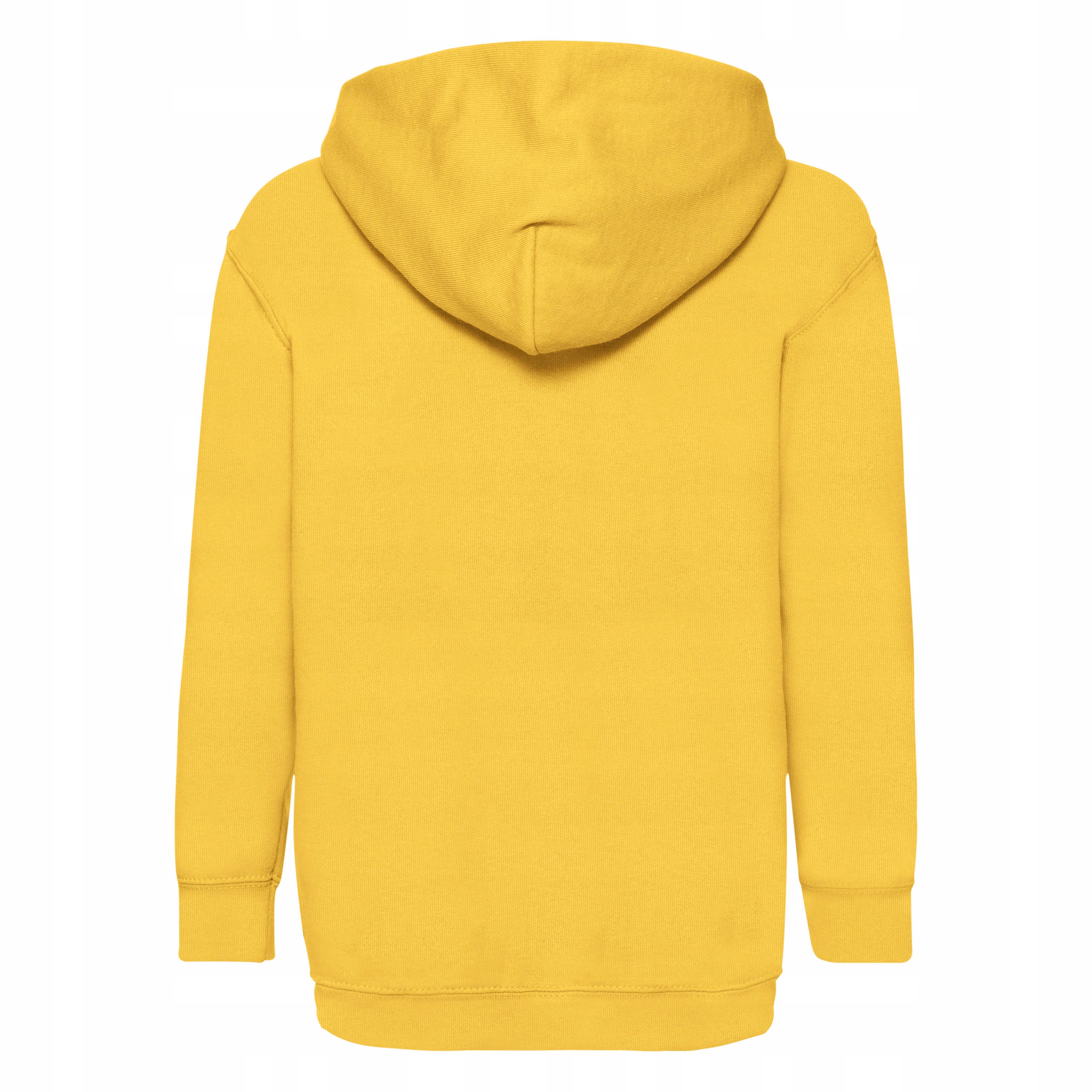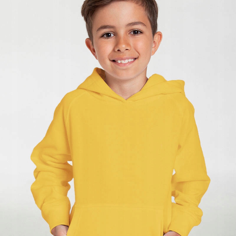 Bluzy dziecięce Hooded Sweat Fruit Of The Loom z kapturem z podwójnego materiału, zszytym z tyłu, bez sznurka. Kieszeń naszyta z przodu. Ściągacze zakończone prążkowaną taśmą bawełnianą z dodatkiem Lycry. Miękka w dotyku przędza Belcoro.