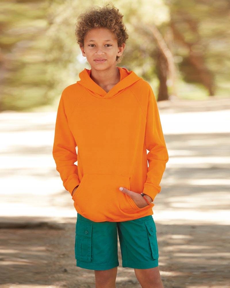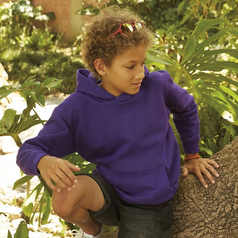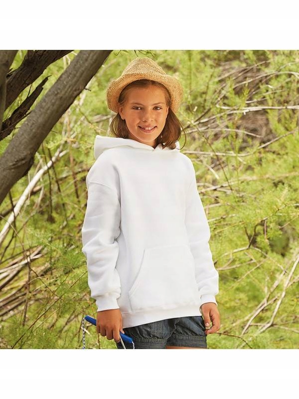 Bluzy dziecięce Hooded Sweat Fruit Of The Loom z kapturem z podwójnego materiału, zszytym z tyłu, bez sznurka. Kieszeń naszyta z przodu. Ściągacze zakończone prążkowaną taśmą bawełnianą z dodatkiem Lycry. Miękka w dotyku przędza Belcoro.