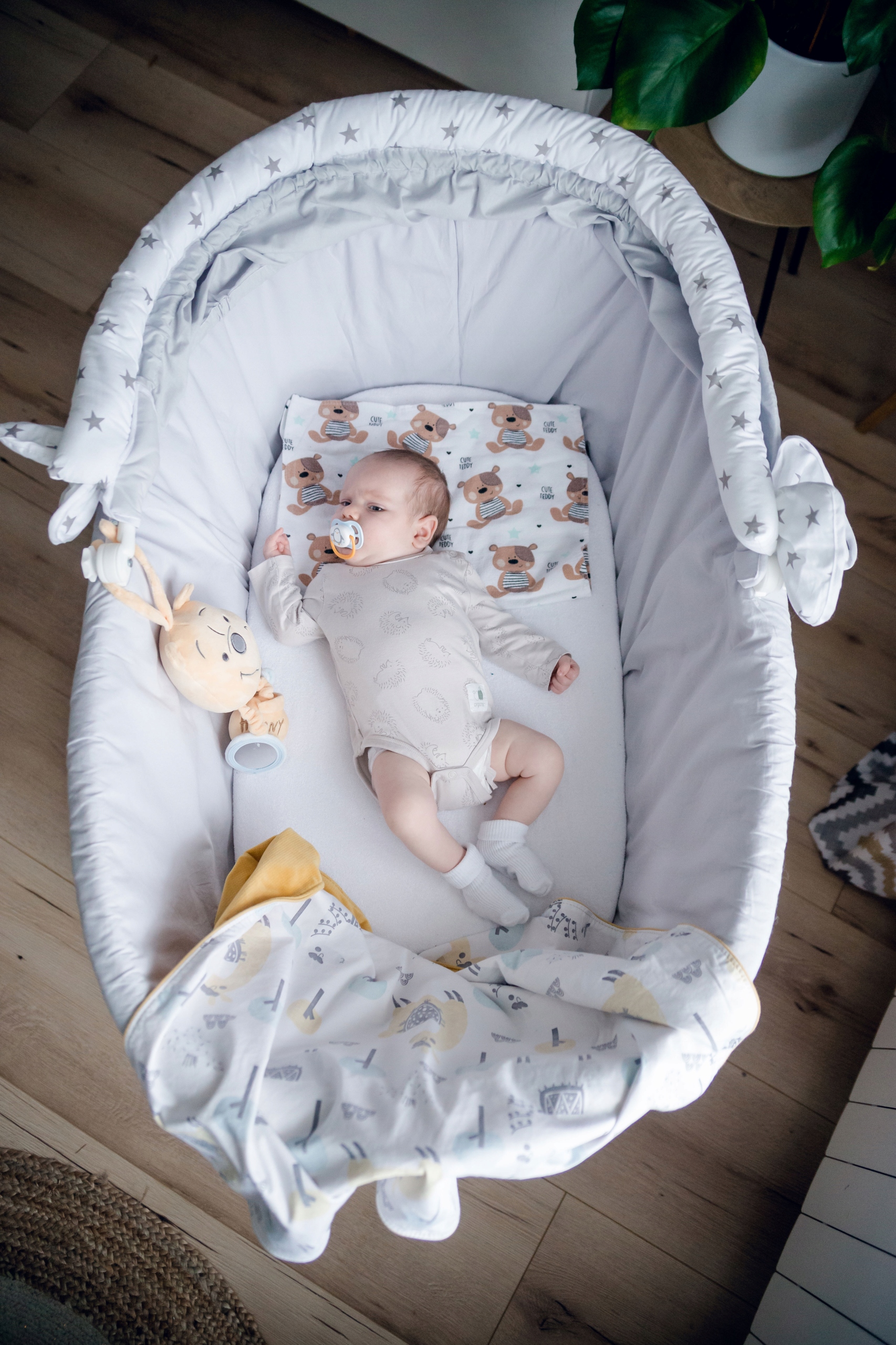 Na tej aukcji kupisz wiklinowy KOSZ MOJŻESZA Z MATERACEM W KOLORZE BIAŁYM Z DODATKAMI WZÓR: PUDROWY RÓŻ, w skład którego wchodzą: