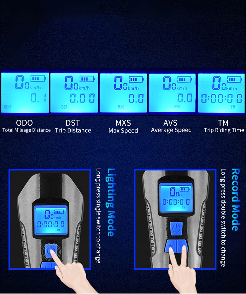 - SPECYFIKACJA – ładowanie: przewód micro USB; licznik o 5 pomiarach: ODO, DST, MXS, AVS, TM; cztery tryby oświetlenia: mocne światło, stroboskop, słabe światło i żółte; wodoodporna: tak; wymiary lampki przód (wys/szer/gł): 4/6/10,5cm; wymiary lampki tył (wys/szer): 7/3cm; waga: 0,12kg; waga w opakowaniu: 0,19kg