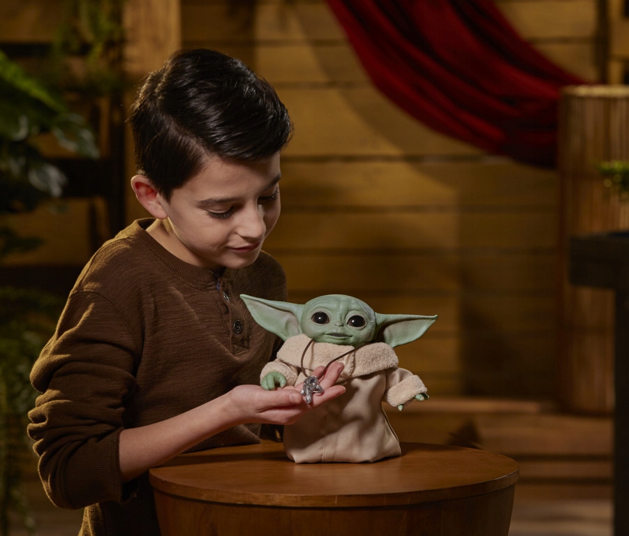 Dotknięcie czubka głowy aktywuje ponad 25 kombinacji dźwięku i ruchu, w tym radosne i podekscytowane dźwięki, chichoty i wiele więcej, a wszystko to podczas gdy głowa postaci porusza się w górę i w dół, uszy poruszają się w przód i w tył, lewa ręka unosi do góry a oczy otwierają się i zamykają. Połóż Baby Yoda, a on zamknie oczy i zrobi "wymuszoną drzemkę". Wiernie odwzorowana figurka Baby Yoda ubrana jest w materiałowy strój, który bohater nosi w serialu - wygląda tak samo słodko jak w filmowych przygodach.