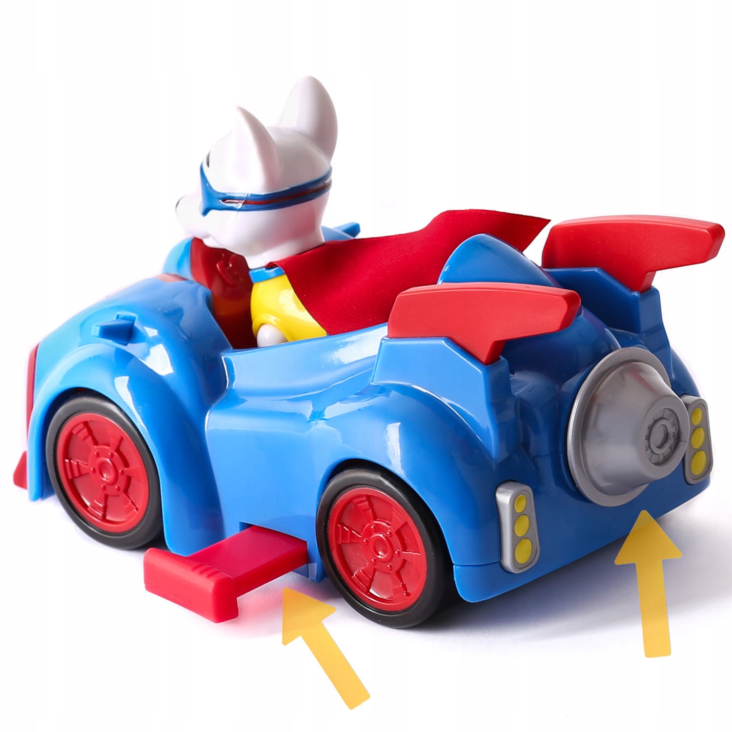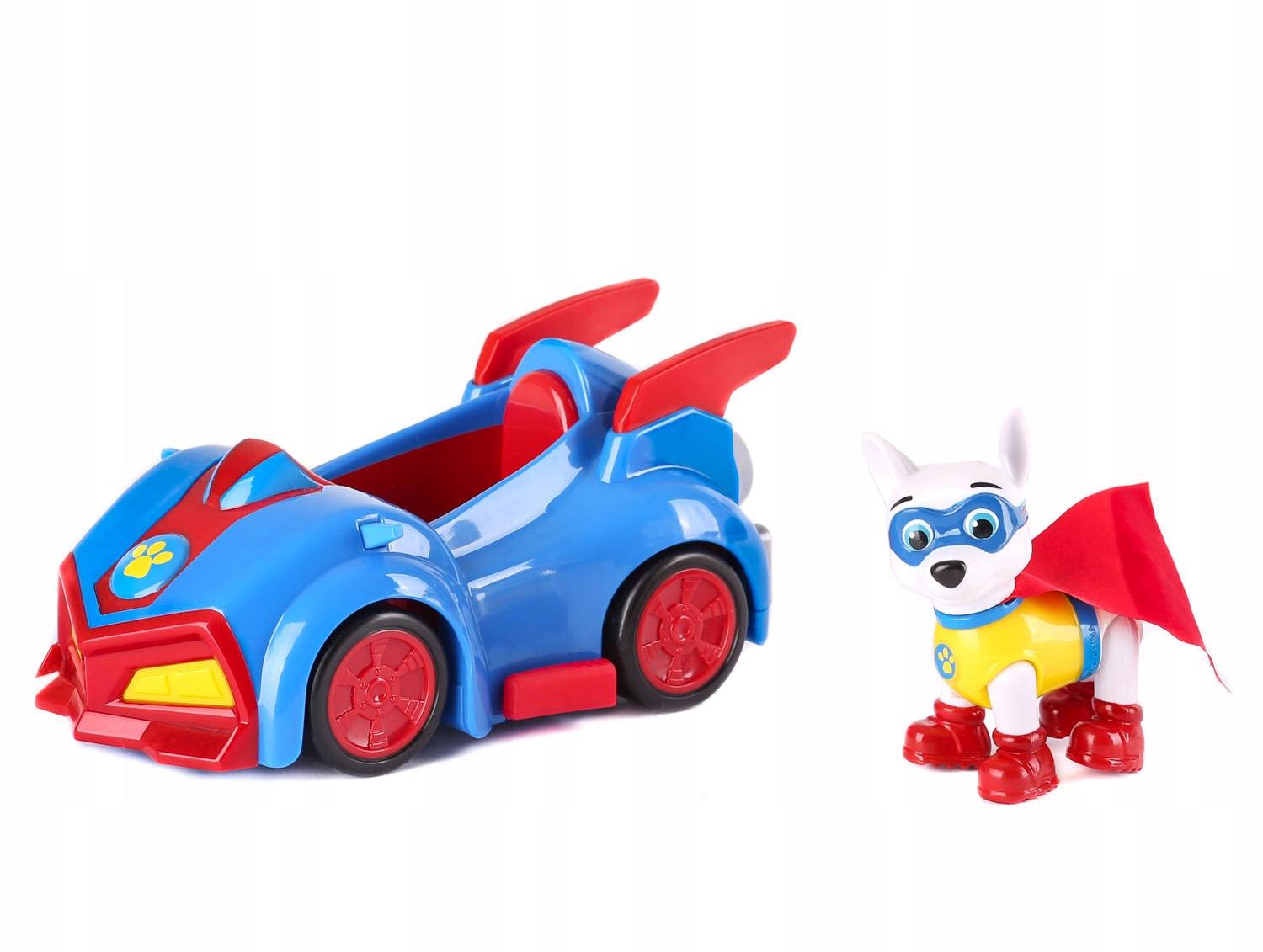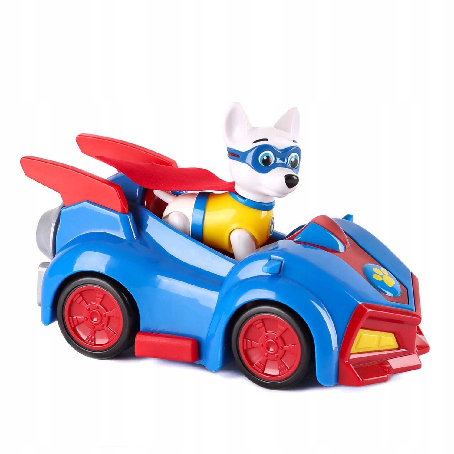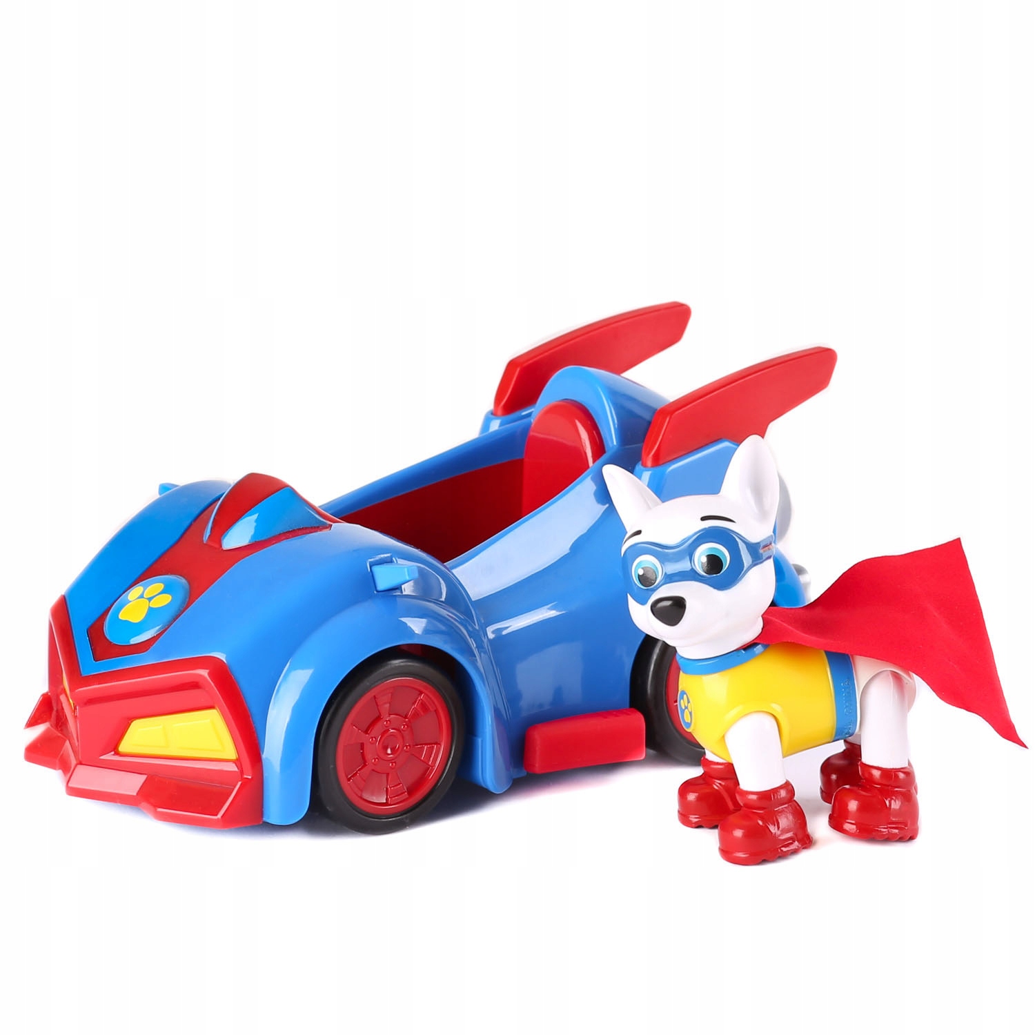 The figurine is an exact copy of the series "Super Dog". Apollo is a pitbull terrier with white fur and a red cape. He has a super car with retractable side wings at his disposal.