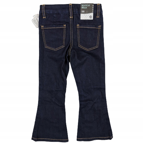 Spodnie w fasonie BOOTCUT (dzwony). W kolorze ciemnego granatu. W pasie do regulacji (gumka - guziczki). Z tyłu naszyte kieszenie, z przodu przeszycia imitujące kieszonki :) Zapinane z przodu na suwak i guzik.