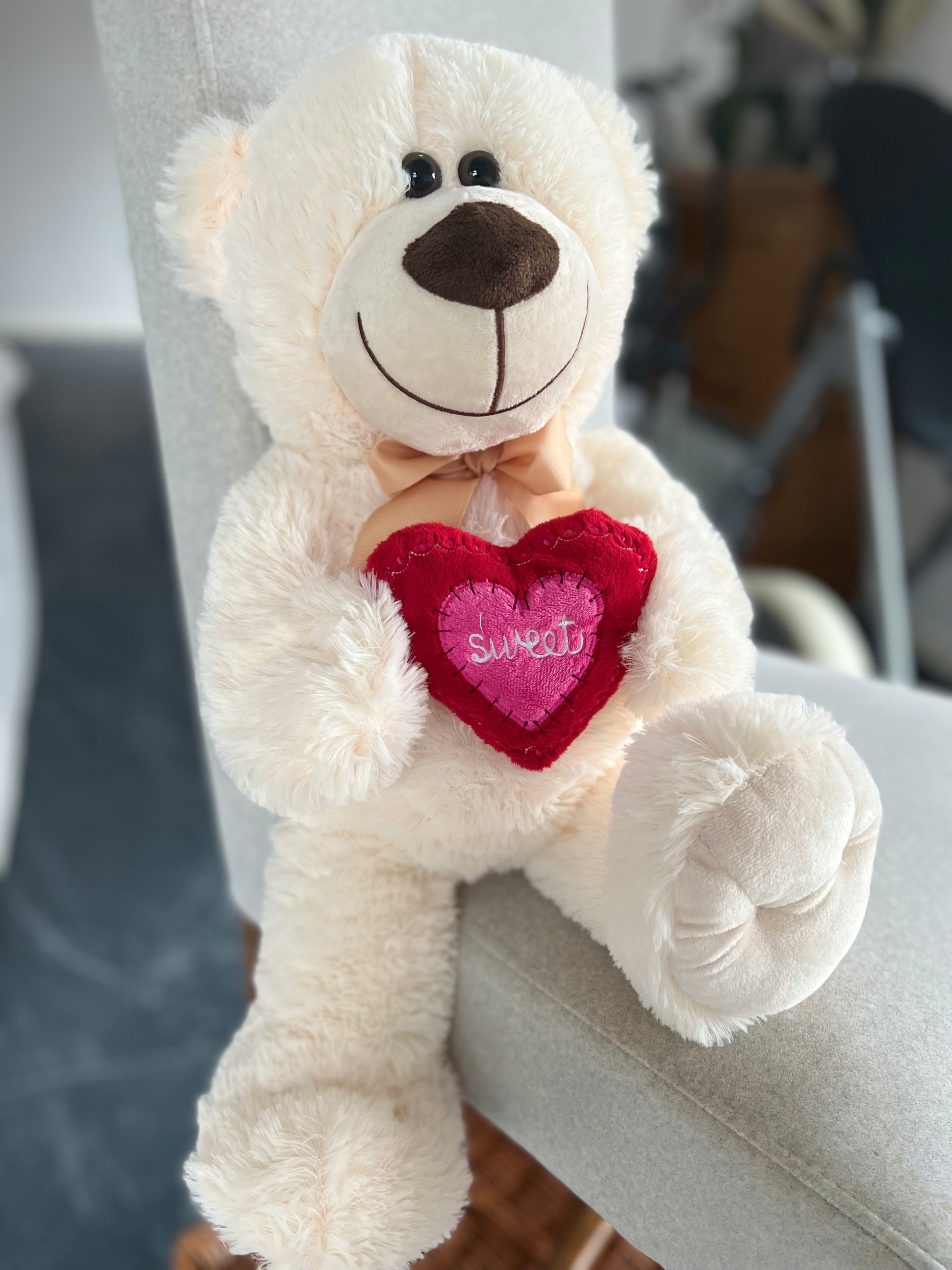 Delicate, fluffy teddy bear in the color CREAM with a heart.