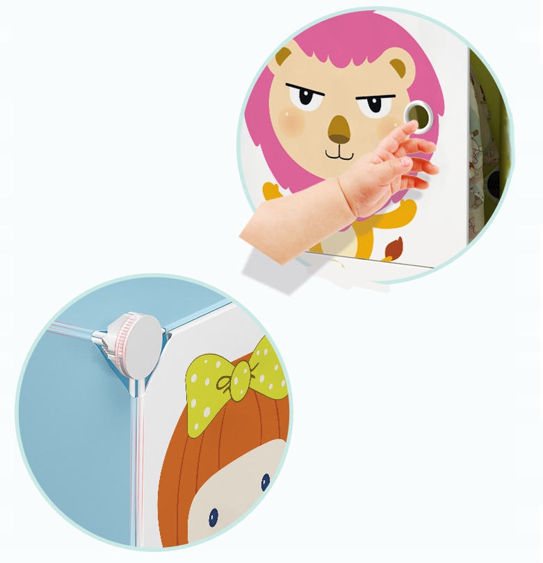 Szafa ma metalowy stelaż z łącznikami z tworzywa sztucznego. Jest bardzo prosta i szybka w montażu, a także w składaniu –składa się w kilka minut. Sprawdzi się też w przypadku wyjazdów lub gdy często zmieniamy miejsce zamieszkania. Półki posiadają magnesy w blokadach, dzięki czemu półeczki nie otwierają się same.