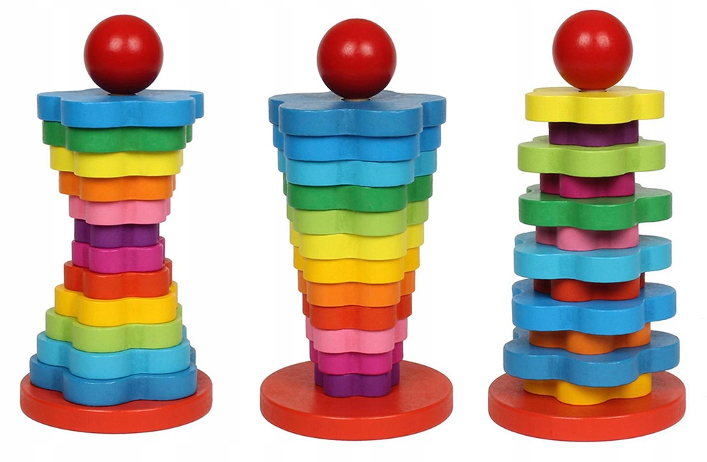 Wieża posiada dwa rodzaje drewnianych klocków, zewnętrzne kolorowe kółka i wewnętrzne kolorowe różne kształty, które dziecko musi dopasować żeby ułożyć całą wieżę.