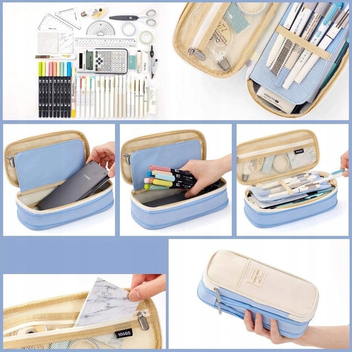【Duża pojemność】 ulepszony rozmiar 8.66x4.13x2.56 cala z dużą pojemność przechowywania, może przechowywać do 50 długopisów lub 90 ołówków i może przechowywać małe artykuły papiernicze w siatkowa torba, takie jak guma, naklejka, itp. W środku małej antresoli, Można umieścić kilka krótszych długopisów, które są często używane.