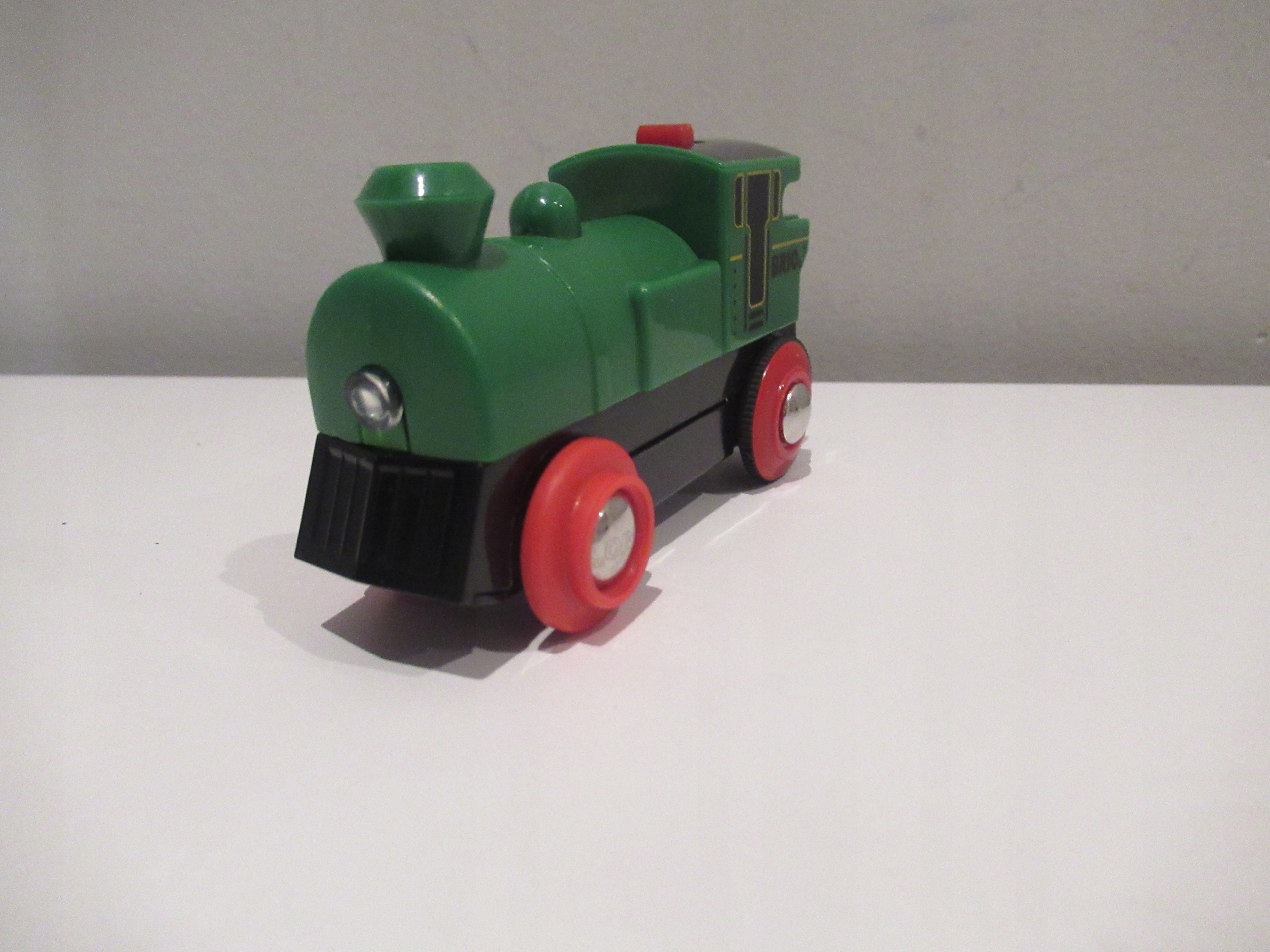 Ta zasilana na baterie, zielona lokomotywa jeździ w dwóch kierunkach i będzie dodatkowym elementem Twojego świata Brio. Naciskając przycisk na dachu lokomotywy uruchomisz silnik i włączysz reflektory, oświetlające tor. W drogę!