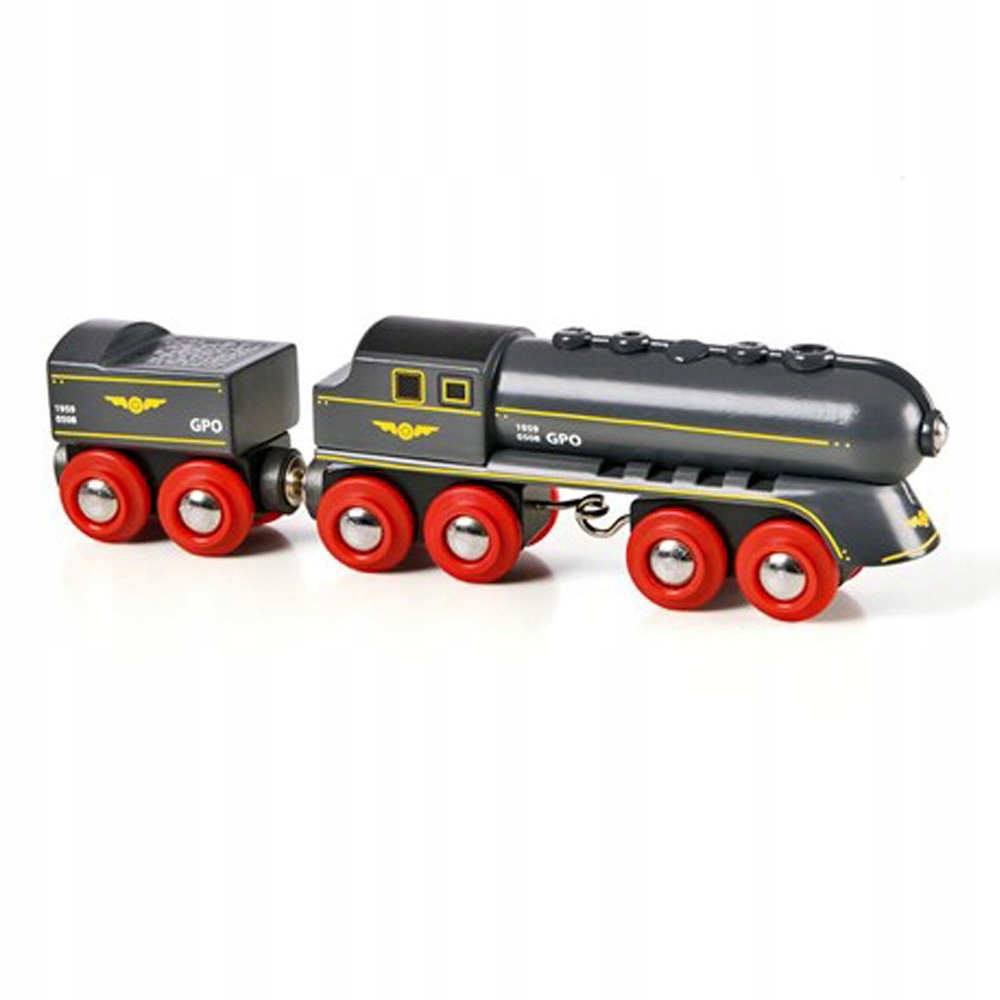 Duża lokomotywa parowa o opływowym kształcie do pociągów ekspresowych. W komplecie mały wagon na zapas węgla.