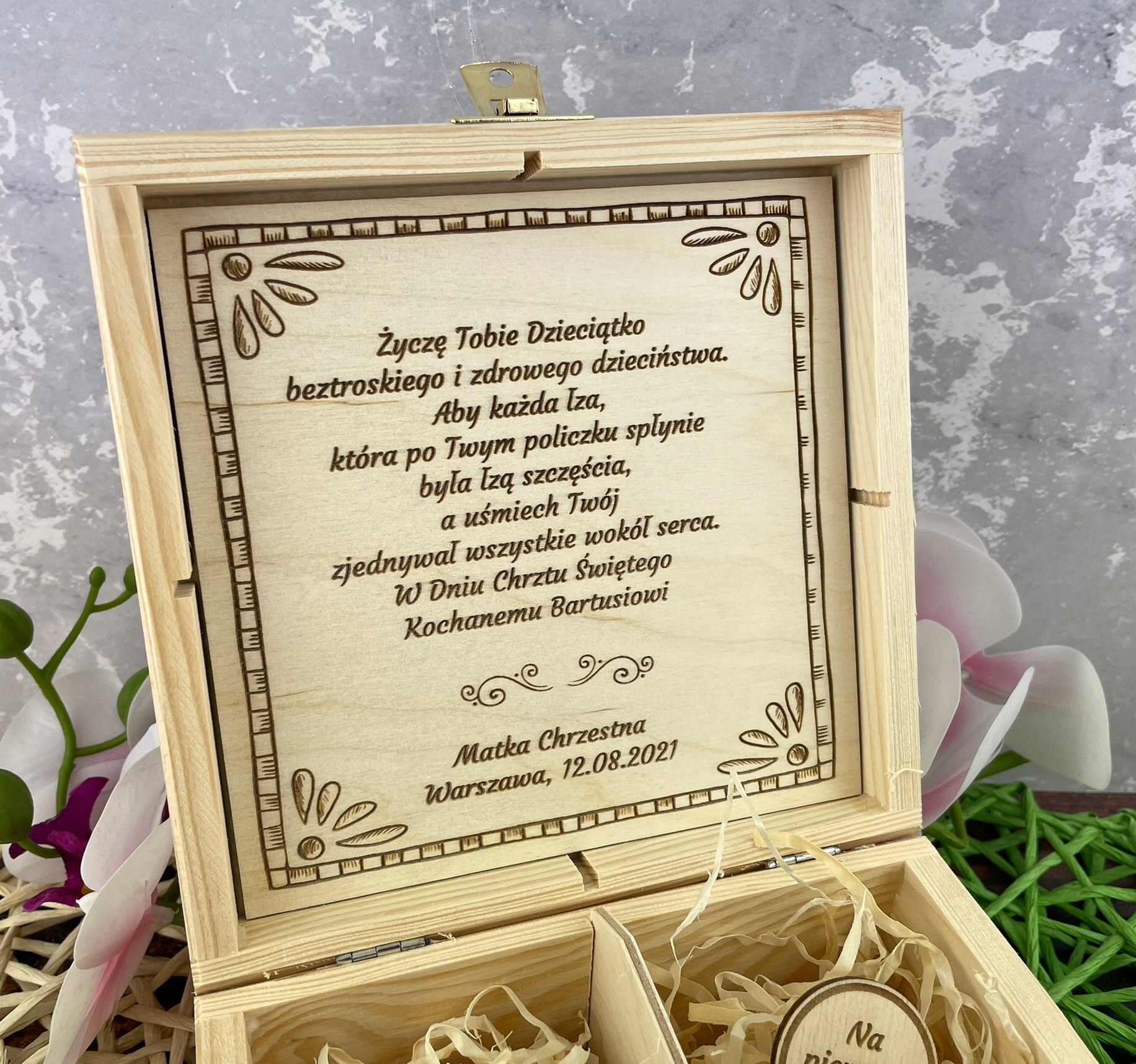 Pudełko z zewnątrz ozdobione jest grawerem. Na pokrywie umieszczamy imię maluszka. Dodatkowo po prawej stronie znajdują się dane na temat urodzin wykonane w technice graweru laserowego.