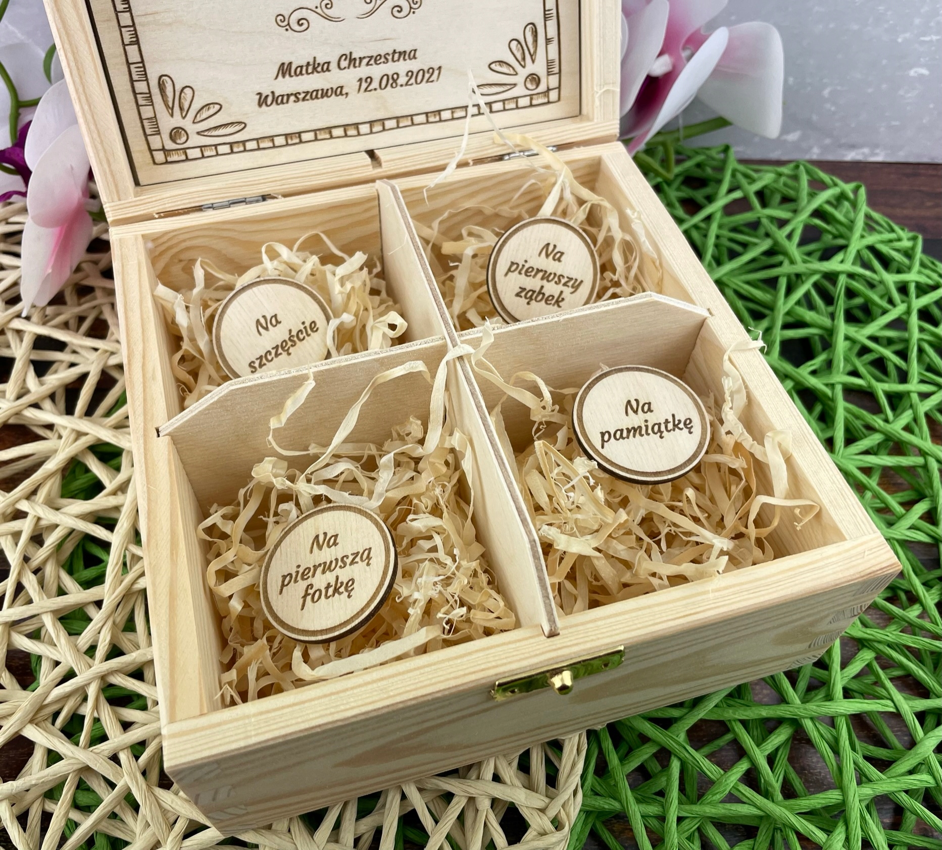 Pudełko ma wymiary 16x16x8 cm i wyposażone jest wewnątrz w 4 przegródki. W przegródkach tych znajdują się miejsca na wyjątkowe rzeczy z życia bobasa :)