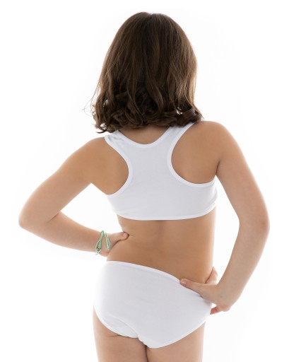 Спортивний топ для дівчинки на товстих бретелях і трусиках для молодої жінки-підлітка. Вони виготовлені з приємної на дотик еластичної тканини. Топ ідеально підходить для занять як ніжний бюстгальтер для маленьких жінок, дуже добре облягає тіло. Інжир не перетискається, має ніжну гумку.