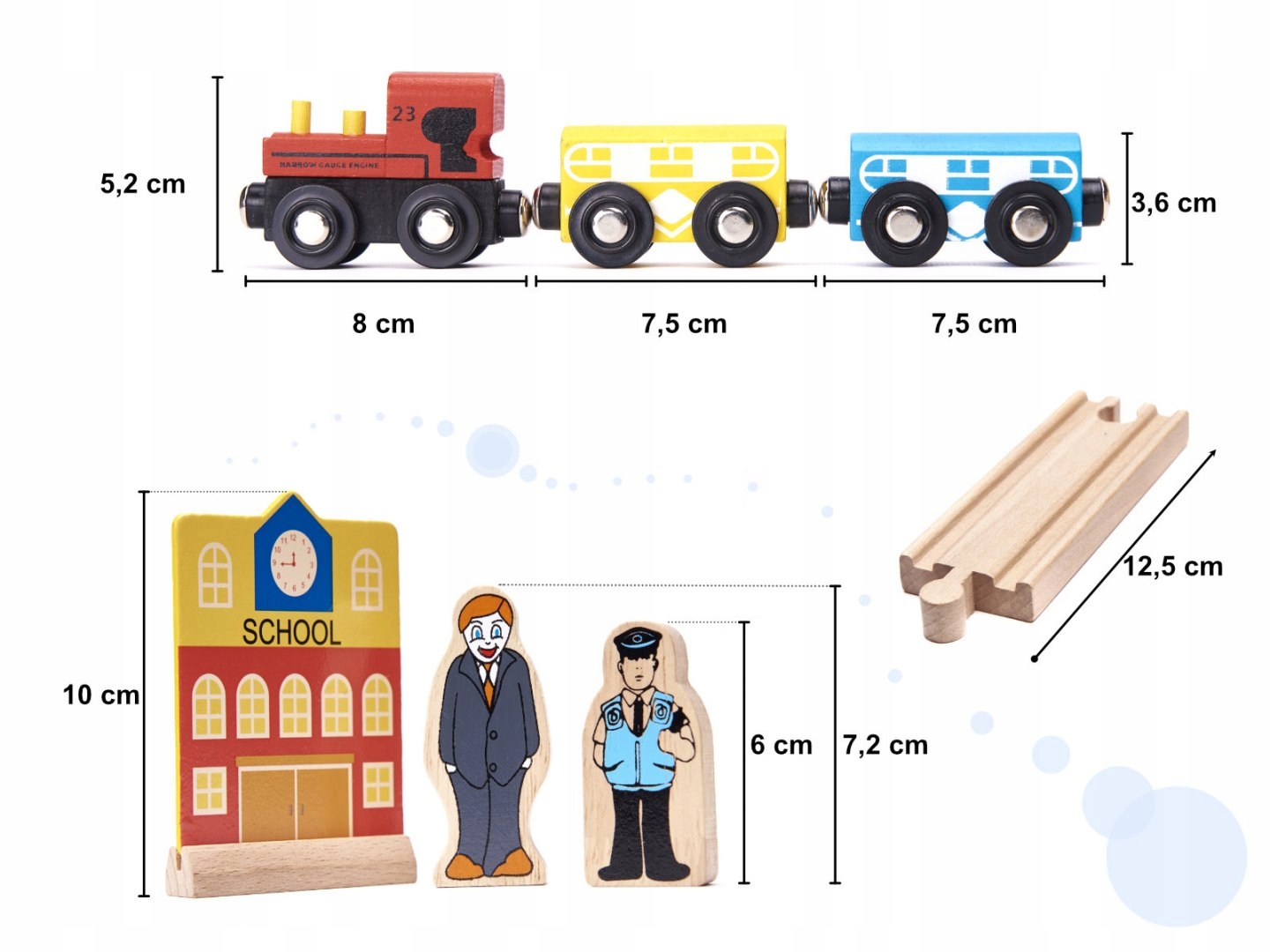 - 8 pojazdów, w tym m.in. lokomotywa z dwoma wagonami, karetka, wóz policyjny