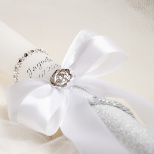 Гарна причасна свічка, декорована вручну. Підготовлено з найкращим почуттям стилю. Виготовлений з компонентів найвищої якості. Свічка, оформлена в універсальному сріблястому кольорі, яка ідеально підійде для святкування Першого Причастя, як для дівчат, так і для хлопців. Шарму додає мотив красивого білого атласного банта та срібної нитки, прикрашеної цирконами.