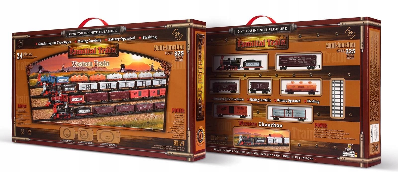 Kolejka kursująca po Dzikim Zachodzie wyposażona jest w trzy wagony towarowe przewożące cenne kruszce i inne specjalistyczne ładunki. Musisz mieć się na baczności, gdyż może dojść do rabunku, a trasa jest długa! Elementy toru można dowolnie łączyć tworząc aż trzy różnej wielkości trasy o średnicach 103,5/129/152 cm.