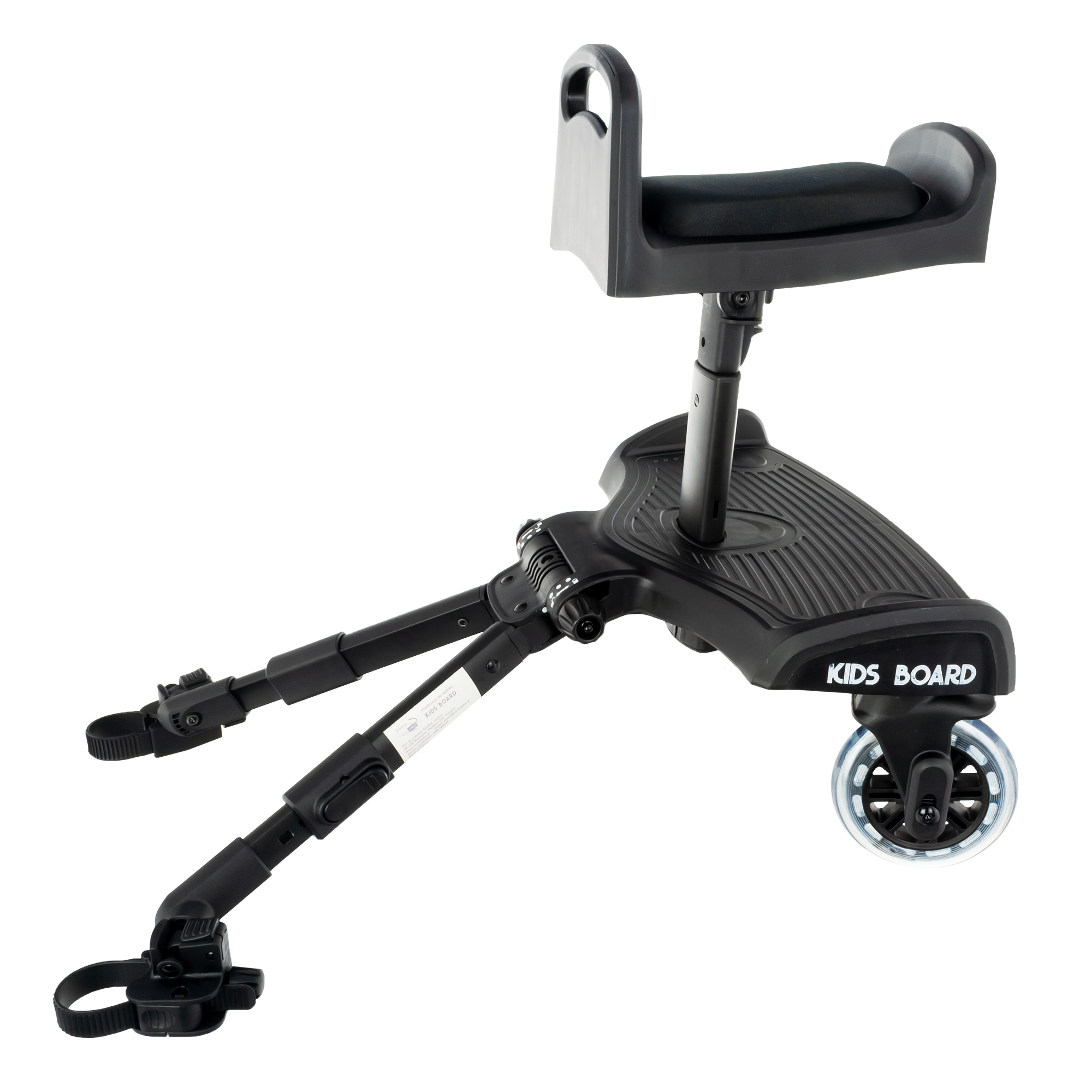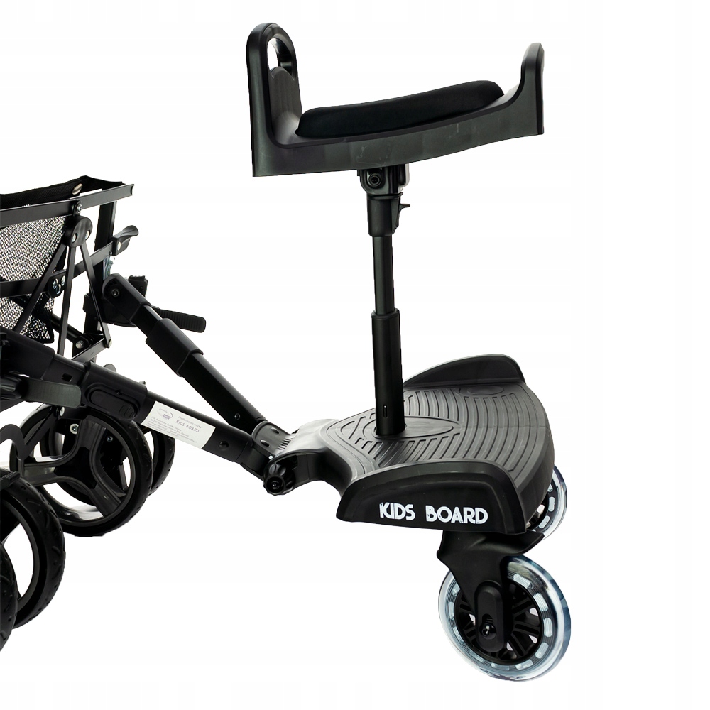 Uniwersalna platforma z siedziskiem do wózka - Kids Board. Maksymalna waga dziecka do 20kg. Dziecko na platformie może siedzieć lub stać. Wygodne piankowe siedzisko z uchwytem do trzymania się. Innowacyjny system zaczepów umożliwia szybki demontaż platformy. Amortyzowane koła zwiększają komfort dziecka podczas spaceru po nierównościach. System regulacji mocowania pozwala zamontować platformę praktycznie do każdego wózka. Posiada również trzystopniową regulację odległości od wózka. Możliwość demontażu siedziska.
