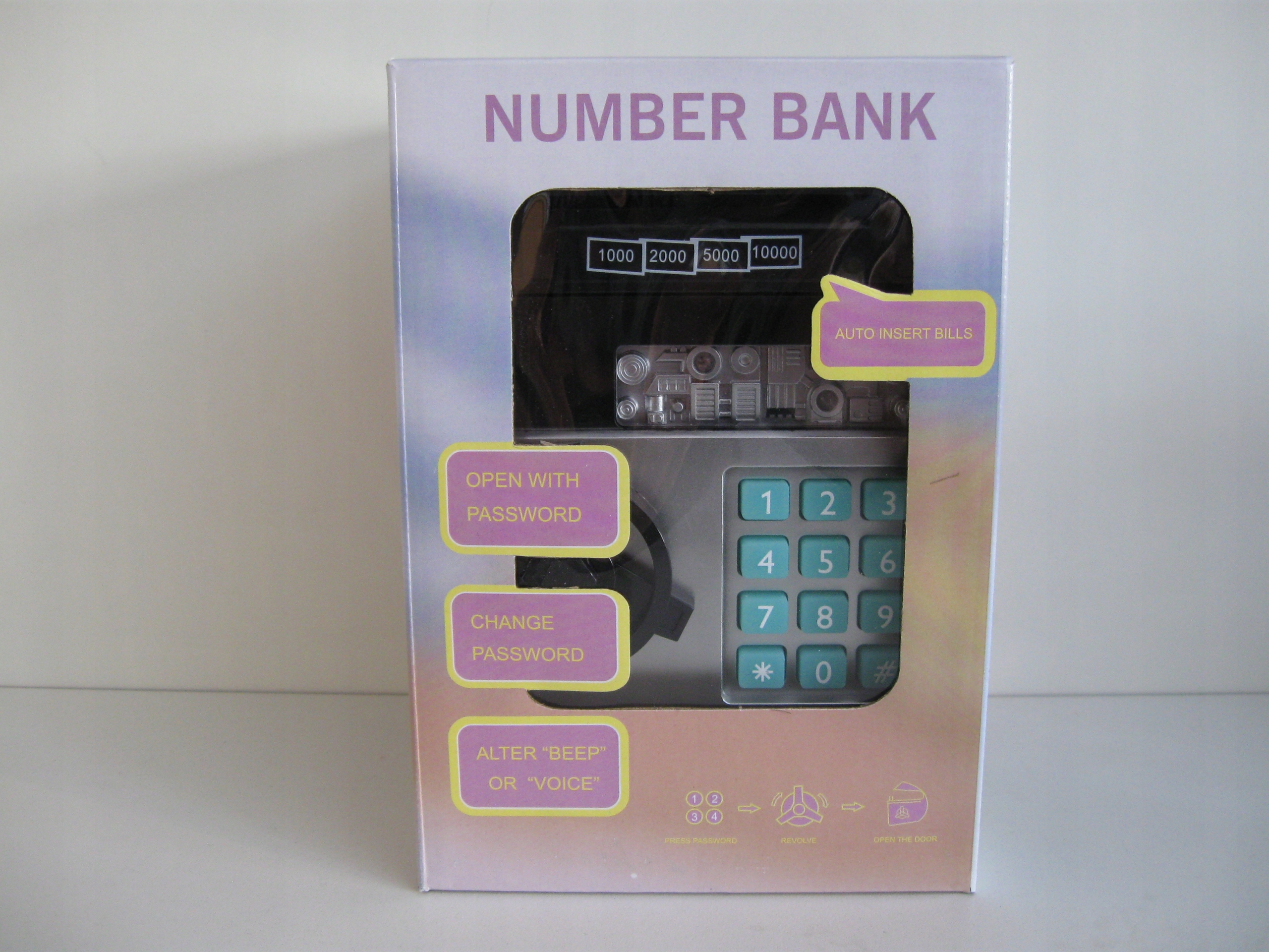 - BLOKADA PIN – skarbonka bankomat zabezpieczona jest specjalnym, czterocyfrowym kodem. By móc skorzystać z oszczędności, które zgromadziła skarbonka sejf należy wpisać prawidłowy PIN. Numer można nadać samodzielnie.