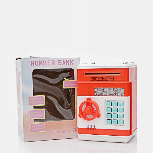 - SPECYFIKACJA – otwierane drzwi po wpisaniu 4 cyfrowego kodu PIN; możliwość wpisania własnego hasła; na banknoty oraz monety; wiek dziecka 6+; możliwość zmiany dźwięków na głos; po 20 sekundach sejf przypomina o otwartych drzwiczkach; wymiary (wys/szer/gł): 19,5/13/12 cm; waga: 0,55 kg; waga w opakowaniu: 0,67 kg.