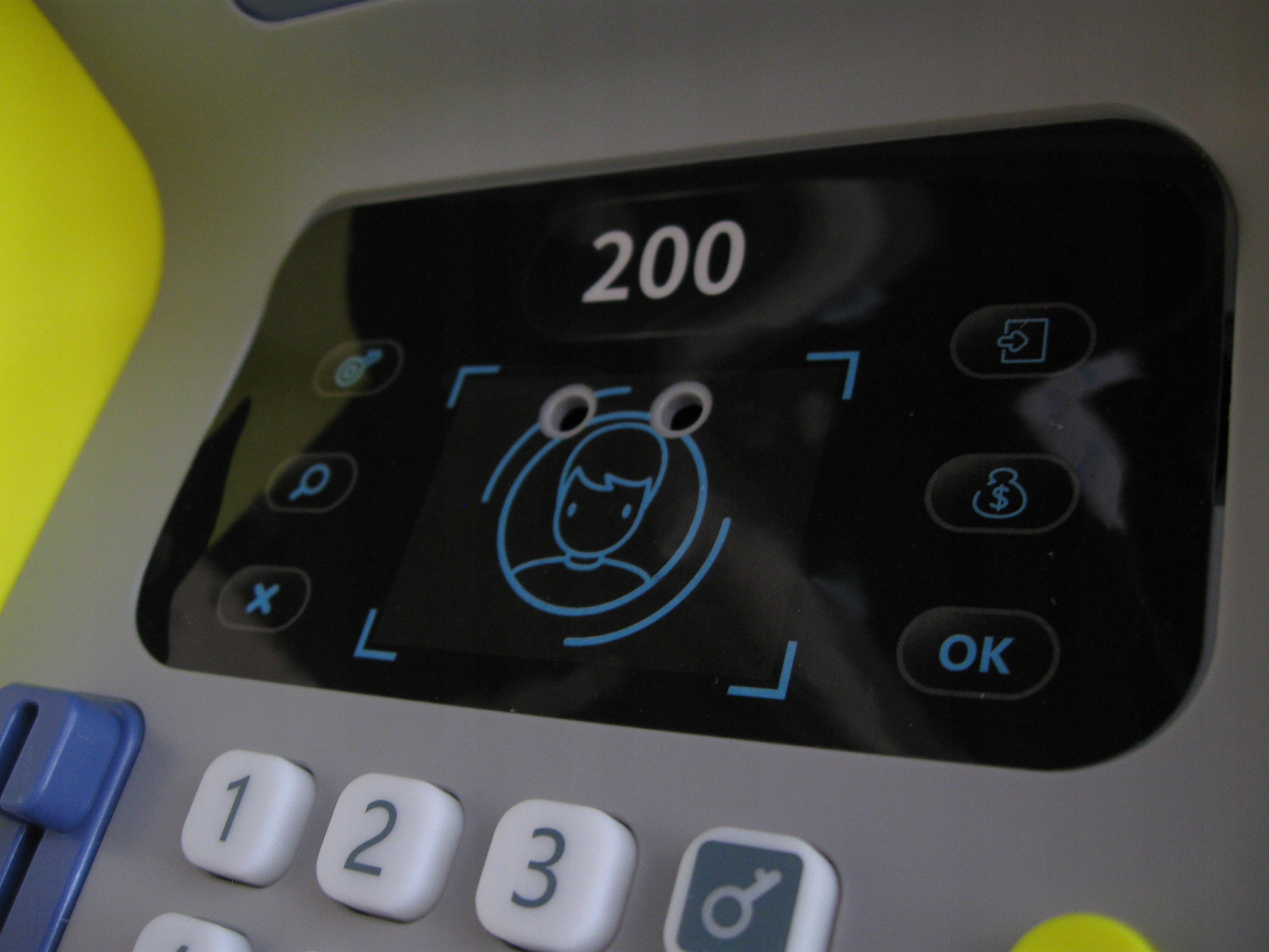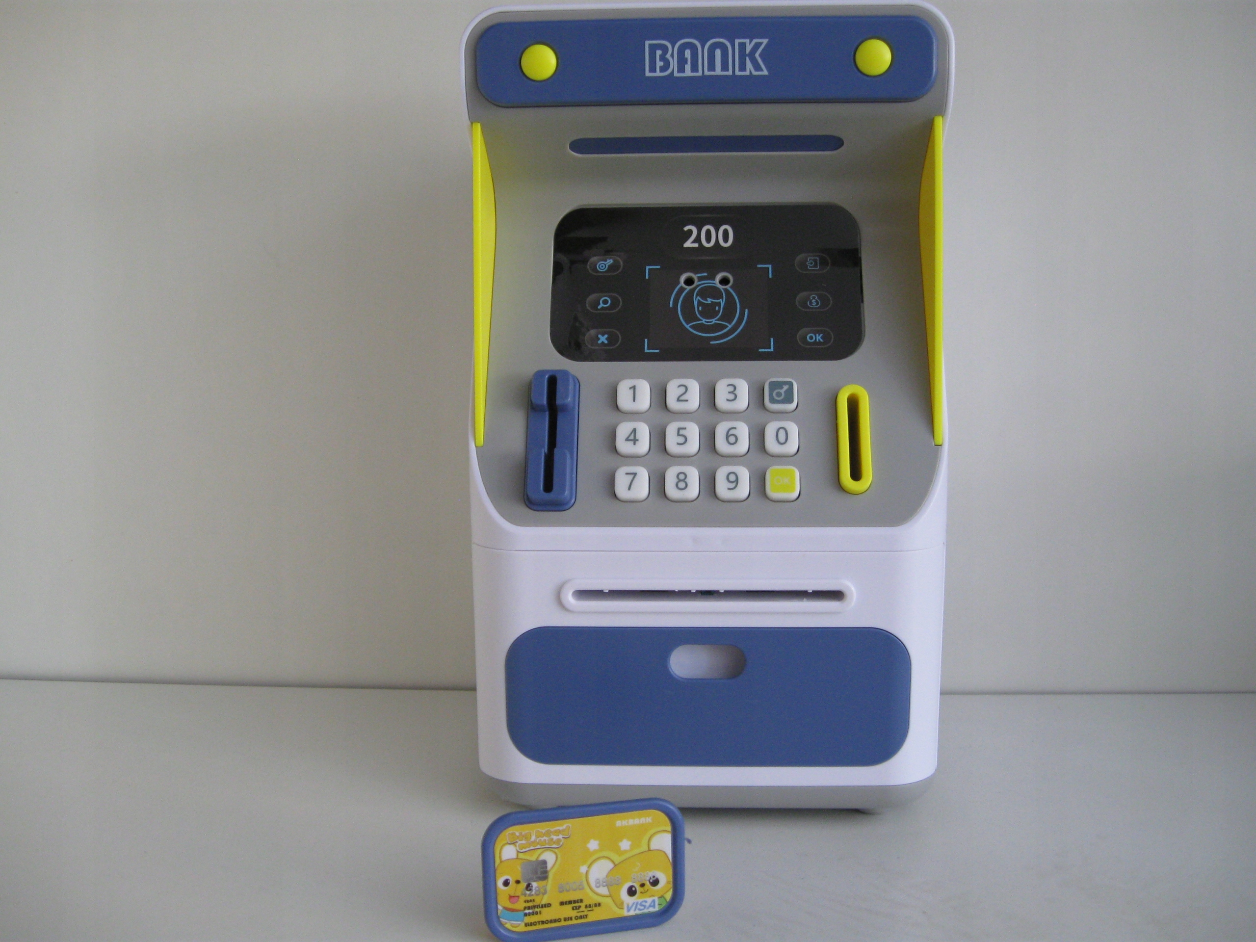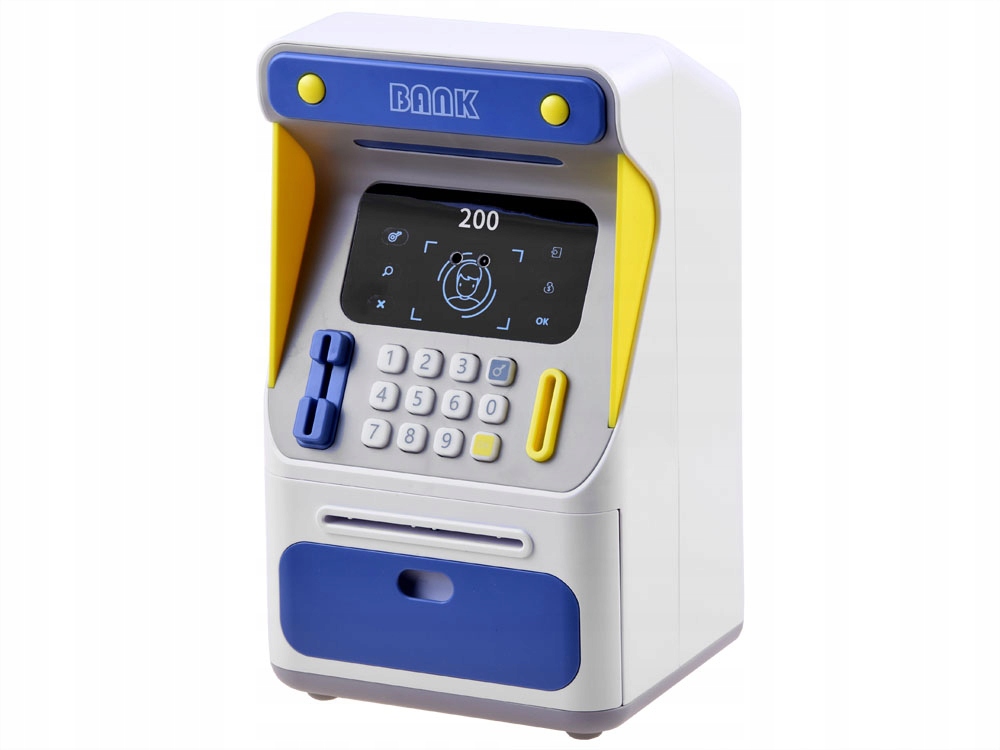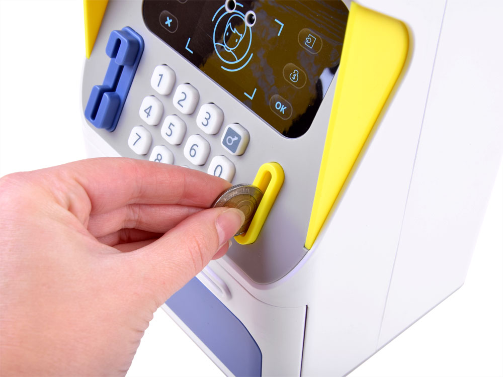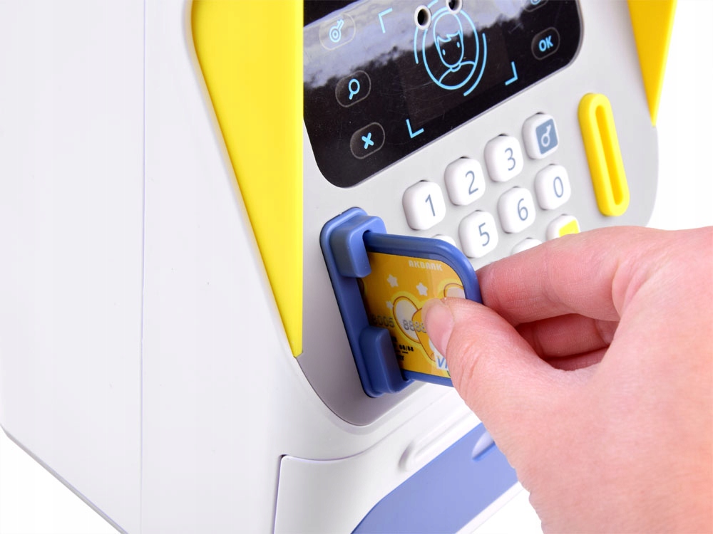 Bankomat posiada funkcję rozpoznawania twarzy, aby się otworzył należy wpisać domyślny pin 000 i nacisnąć przycisk: OK i stanąć przed bankomatem. Po poprawnym wpisaniu kodu usłyszymy wesołą muzykę i drzwiczki się otworzą. W środku będą znajdować się zebrane pieniążki przez Twojej dziecko!