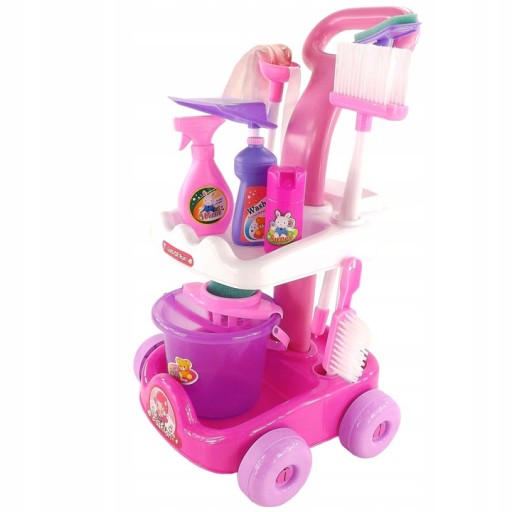 Рожевий візок для прибирання для дітей, відро, швабра, совок, миючі засоби, мітла на колесах
