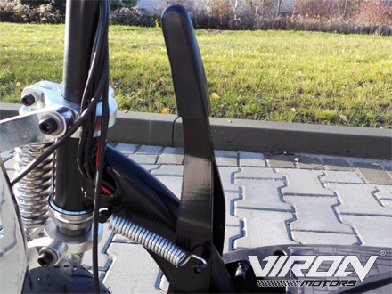 Hulajnoga elektryczna „VIRON” wyposażona jest w mocny silnik elektryczny o mocy 1000 W. 36-woltowy zestaw akumulatorów, składający się z trzech 12-woltowych akumulatorów o pojemności 12 Ah każdy, pozwala na przejechanie maksymalnie do 20-30 kilometrów na jednym ładowaniu akumulatora, w zależności od rodzaju terenu, nachyleniu drogi i nawierzchni. Akumulator można ładować za pomocą ładowarki znajdującej się w zakresie dostawy. Czas ładowania to ok. 6-7 godzin. Prędkość można ograniczyć w 2 etapach za pomocą przełącznika nastawczego. W pierwszym etapie skuter jedzie 6 km / h, w drugim do około 30 km / h. Hulajnoga wyposażona jest w komfortowe siodełko, którego wysokość można regulować za pomocą szybkiego zwalniania. W razie potrzeby siedzisko można łatwo zdemontować w 2 prostych krokach. Aby móc transportować hulajnogę w sposób oszczędzający miejsce, wyposażono ją w jednouchwytową szybkozłączkę, która umożliwia jej złożenie w ciągu kilku sekund. Dzięki pełnemu zawieszeniu, które składa się z widelca amortyzowanego z przodu i dwóch amortyzatorów z tyłu, hulajnoga może być również łatwo prowadzona po nierównych odcinkach. Posiada również metalowe dźwignie hamulca, ergonomiczne uchwyty oraz blokadę zapłonu, która zapobiega nieautoryzowanemu użyciu. Otrzymujesz również praktyczny uchwyt na smartfona, który można przymocować po lewej lub prawej stronie kierownicy. Na przykład zbliżające się trasy, nawigacja (GPS) lub muzyka mogą być odczytywane lub regulowane bezpośrednio z wyświetlacza podczas jazdy. Uchwyt jest bardzo zmienny i można go używać z prawie każdym smartfonem. Dodatkowo uchwyt posiada przegub kulowy, dzięki czemu można wyrównać wyświetlacz w formacie pionowym lub poziomym.