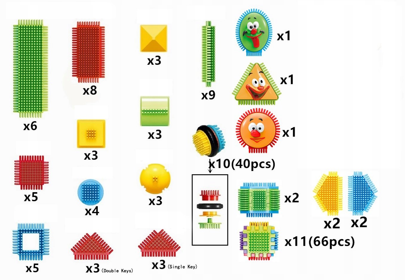 - Kolorowe klocki - prostokątne, kwadratowe, trójkątne, koła zwykłe oraz kręcące się, zakończenia typu "daszek", 3 klocki z wesołymi buźkami oraz klocki heksagony,
