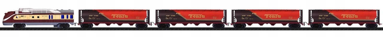 Oferowana kolejka wyposażona jest w lokomotywę oraz cztery różne wagony towarowe, które przewożą specjalistyczny ładunek sprawią, że dziecko pobudza wyobraźnię i kreatywność.