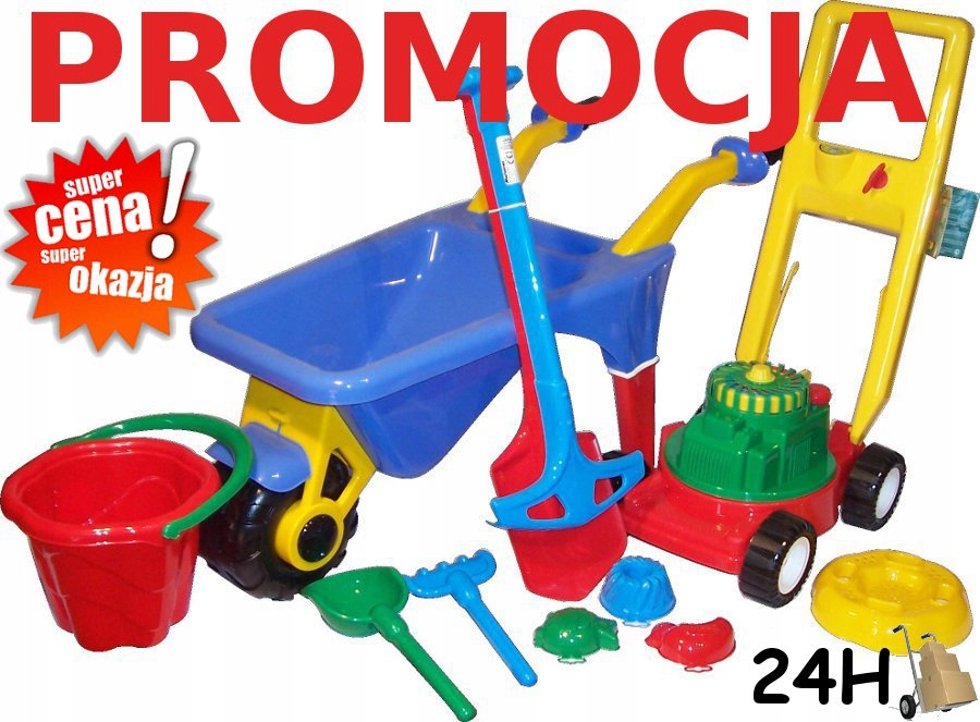 TACZKA + KOSIARKA +GRABIE +ŁOPATA+WIADRO Z FOREMKAMI