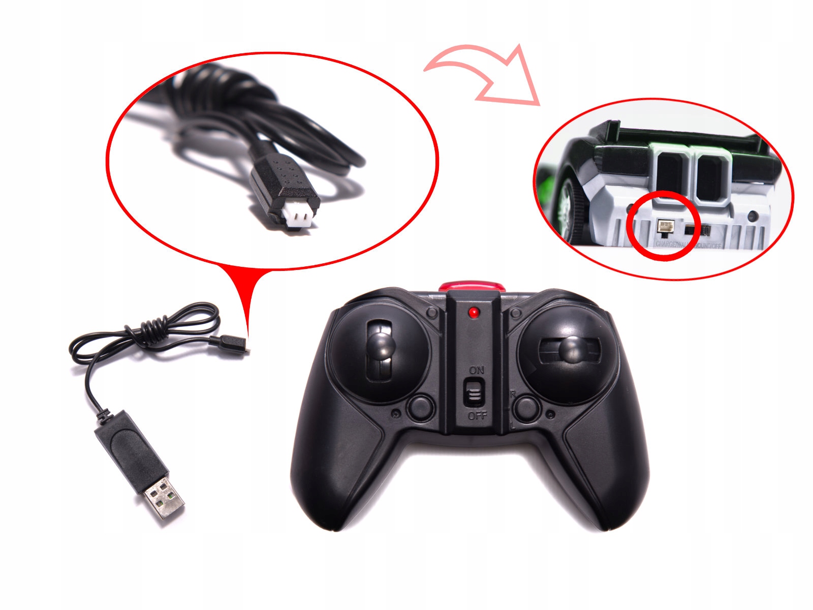 - Sterowany klasycznym pilotem z dwoma joystickami (na 2 baterie typu AA - brak w zestawie)