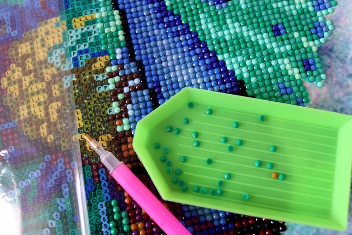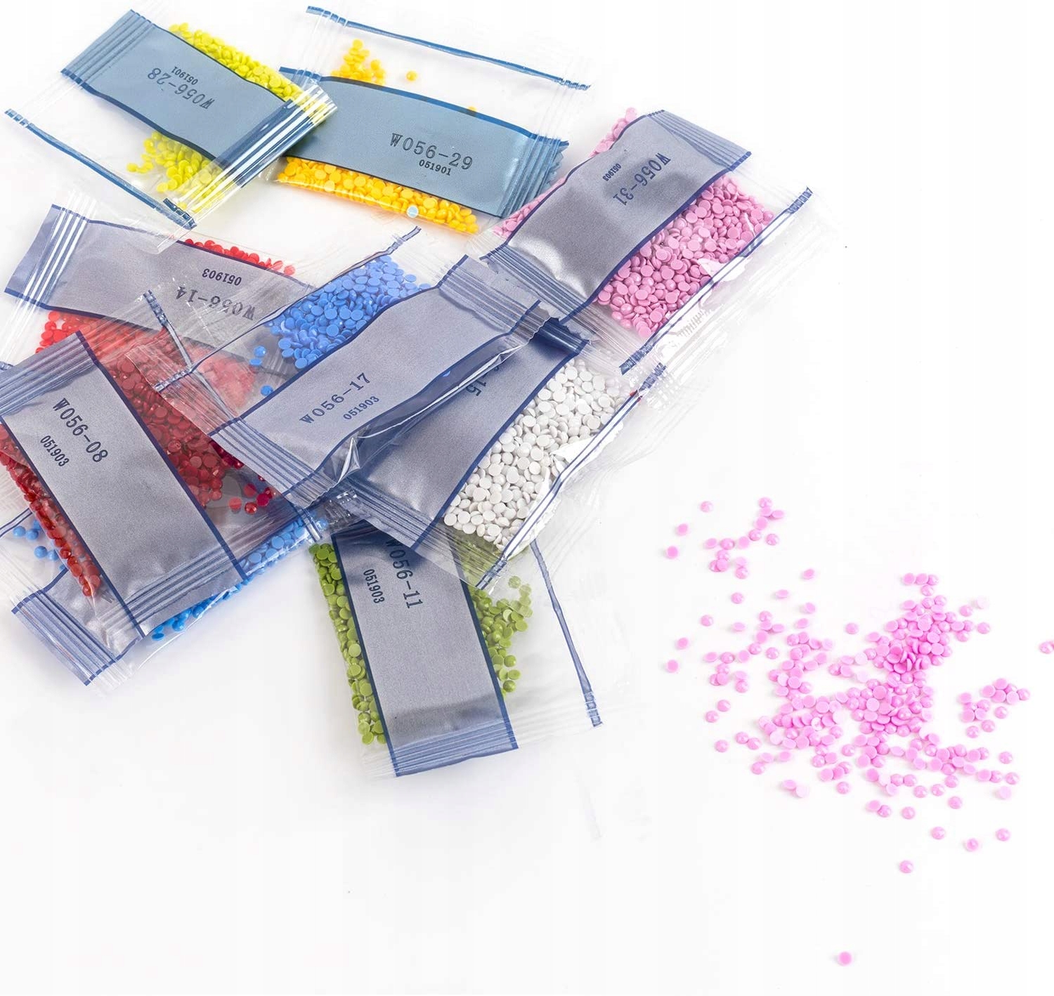 3. Wybierz diamenciki, które będziesz wyklejać. Znajdź na odkrytej części płótna odpowiednie symbole i numery. Wsyp do plastikowego pojemnika porcję wybranego koloru kryształków.