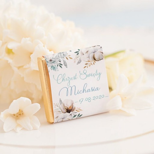 - Смачні бельгійські шоколадні цукерки, загорнуті в золотистий елегантний папір. Крім того, вони мають унікальну персоналізовану етикетку з квітковим декором із колекції Charming Boy. На етикетці буде розміщено декоративний напис: Baptism Å.w. та персоналізація: