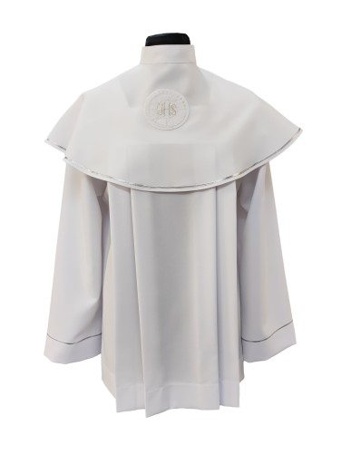 Причастя з двох частин причастя з нашийником. Комір застібається ззаду, спереду вшита срібна ХОСТ. Мінімальна кількість прикрас, комір і рукава оброблені сріблястою стрічкою. Кома виготовлена із синтетичної тканини "стрейч". Кома дуже практична у використанні, легко переться і прасується. Koma доступна в розмірах 134-140-146.