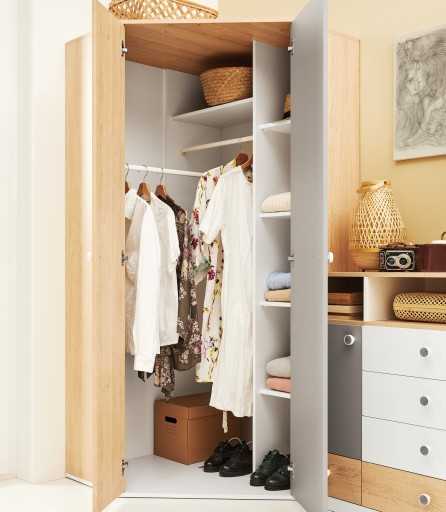 - ПІКСЕЛЬ âPX03 в80х190х50☑ дводверна шафа з двома ящиками, 4 полиці у вужчій частині та полицею та вішалкою за широкими дверима