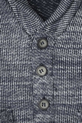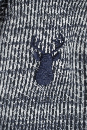 Абсолютно новий светрДаліу відтінку білий і темно-синій (меланж). Застібається спереду на ґудзики.Довгі рукави, оздоблені темно-синьою облямівкою. Має дві кишені спереду. Низ светра оброблений темно-синьою обшивкою. Поруч на комірі вишитий олень.