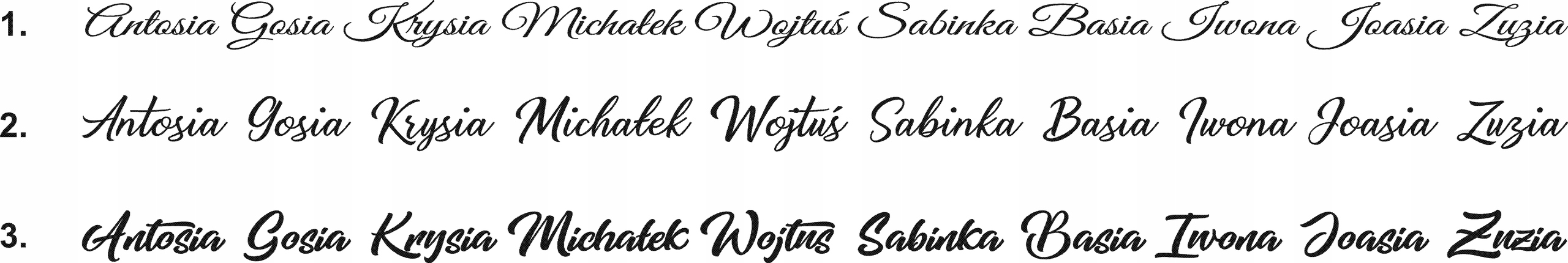 Poniżej prezentujemy do wyboru trzy różne kroje czcionek z tymi samymi imionami, żeby zobaczyć jak zmieniają się litery w danym kroju.
