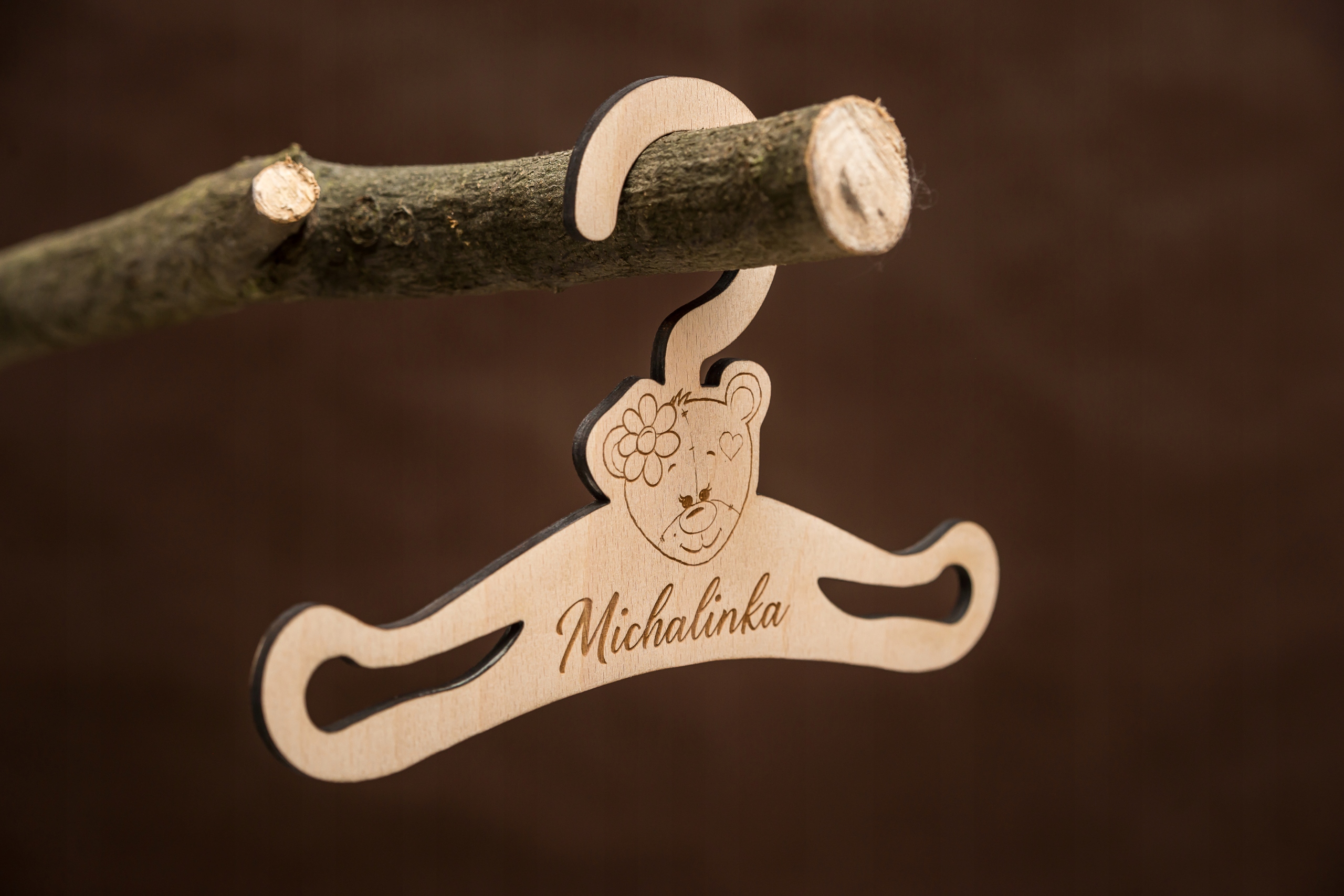 Drewniany wieszak z grawerowanym imieniem dziecka.