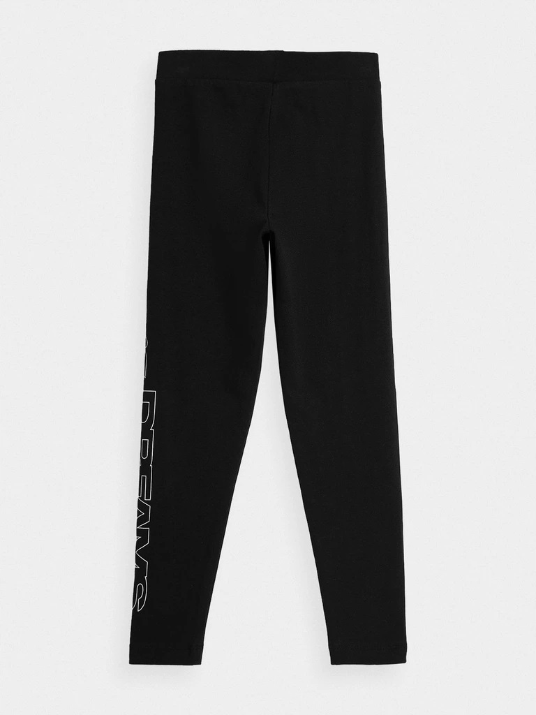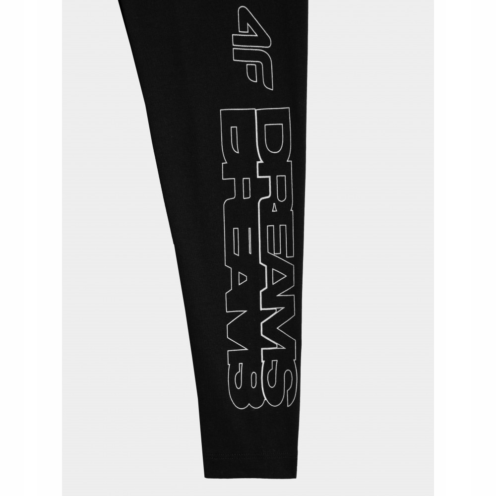 Leginsy dziewczęce 4F w kolorze czarnym, z dużym nadrukiem i logiem na lewej nogawce.