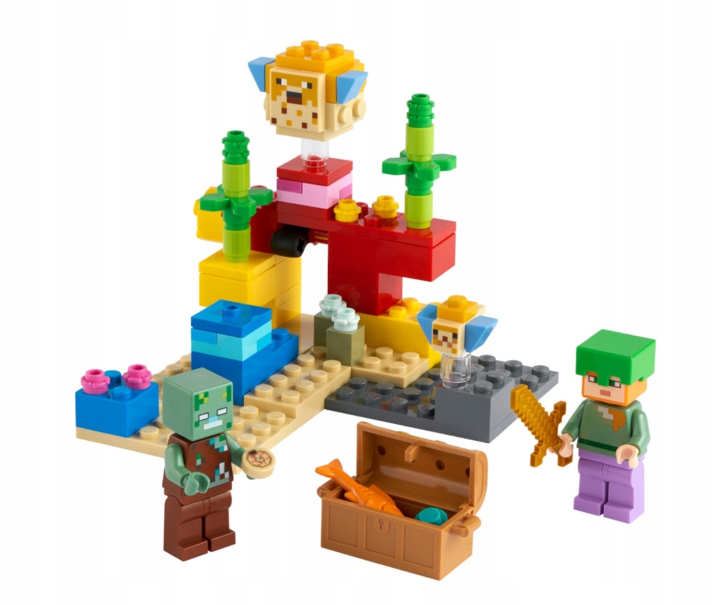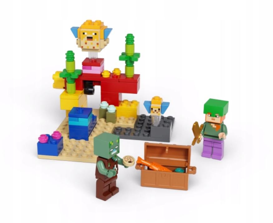 - Kolorowa rafa koralowa jest pełna autentycznych detali znanych z Minecrafta™ oraz niesamowitych akcesoriów takich jak ukryta otwierana skrzynia ze skarbem: rybą i perłą.
