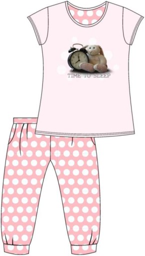 Піжама-двійка для дівчинки з якісної натуральної бавовни. Футболка з коротким рукавом і круглим вирізом ніжно-рожевого кольору. У центральній частині принт плюшевого зайчика поруч із будильником на фоні білих кіл. Нижче написано: «Час спати». Рожеві штани 3/4 мають широкий еластичний пояс. На висоті стегон дві практичні кишені, а штанини оброблені манжетами. Нижня частина піжами має великий візерунок у білий горошок. Це виключно комфортна дівоча білизна, ніжна до шкіри. Він ідеально підійде для теплих весняних і літніх вечорів.
